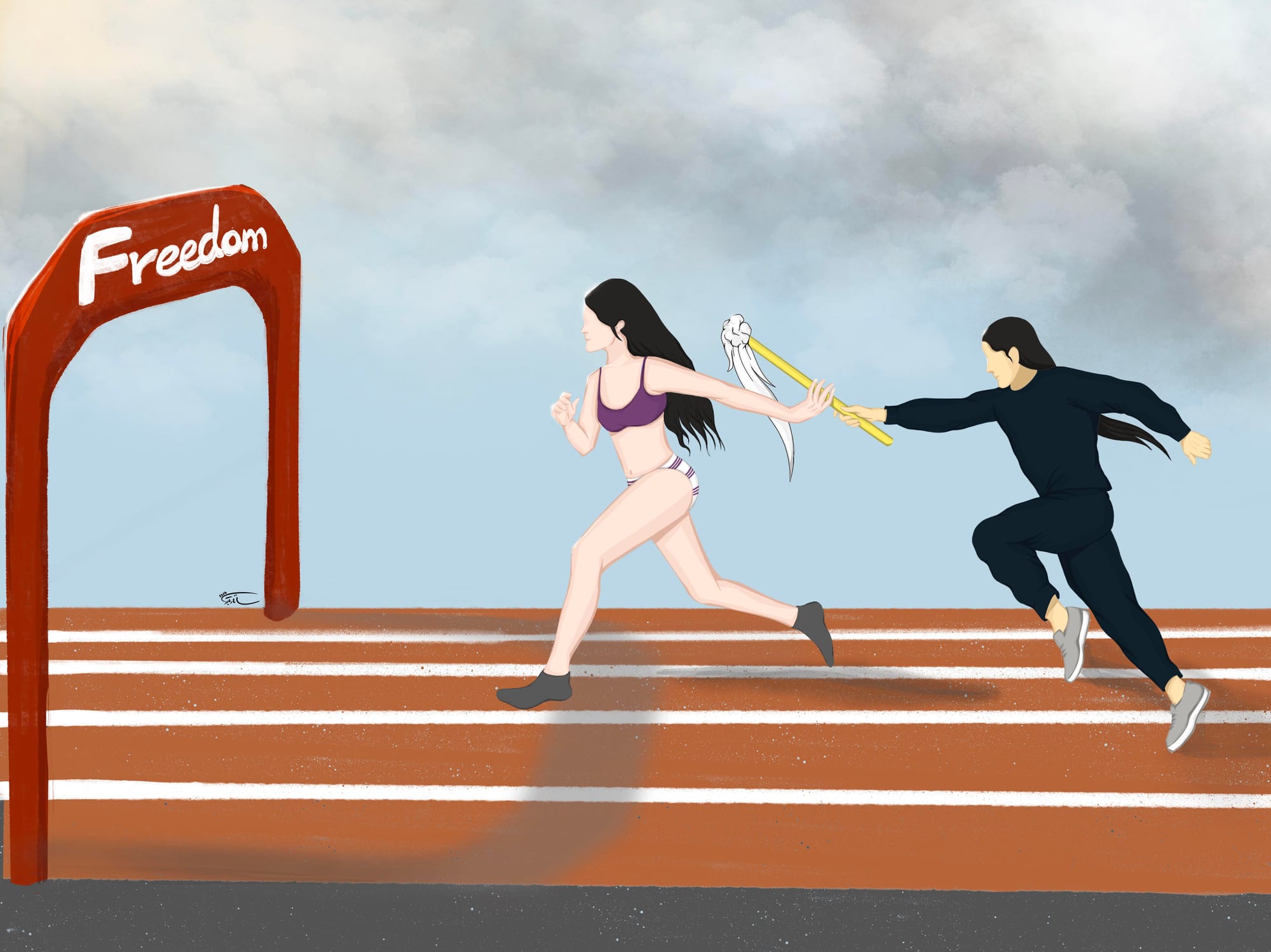This was not an isolated protest. Iranian women have long resisted the compulsory hijab, using nonverbal acts to defy the state’s strict dress codes. This movement began years ago in quieter, subtler forms: women wearing their headscarves loosely, discarding their veils, and expressing dissent through subtle but powerful body language. In 2017, a woman named Vida Movahed took this resistance to the public stage. Standing on a utility box on Tehran’s busy Enghelab (Revolution) Street, she waved a white headscarf on a stick — a striking image that captured the essence of Iran’s feminist struggle and inspired countless others, later known as the “Girls of Revolution Street.” Since then, women have performed creative acts of defiance with their scarves, twirling them, casting them into the wind, and even burning them. Daryaei’s act of stripping to her underwear continues this trend. One illustration poignantly captures this connection, depicting Daryaei running toward a hurdle labeled “freedom” on a track, as she receives the iconic white scarf on a stick as a baton from Movahed. These acts embody a larger struggle for bodily autonomy, freedom, and the right to self-expression.
