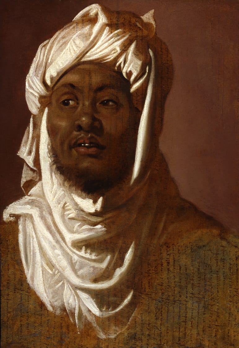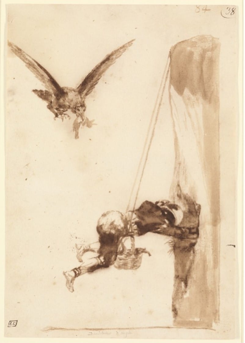 The drawings mostly date to the 16th century and the majority are by Italian artists. Also represented is Rubens, whose early 17th-century oil-on-paper work of an African man served as the study of one of the central figures in his famed “The Adoration of the Magi.” And from Goya arrives a particularly foreboding brush-and-ink drawing: “The Eagle Hunter” (1812–20) portrays a hunter hanging from a cliff to reach for eggs in a nest, his face hidden by a metal cooking pot that serves as a helmet — particularly necessary in this scene, as the parent eagle appears behind him, with sharp claws at the ready.