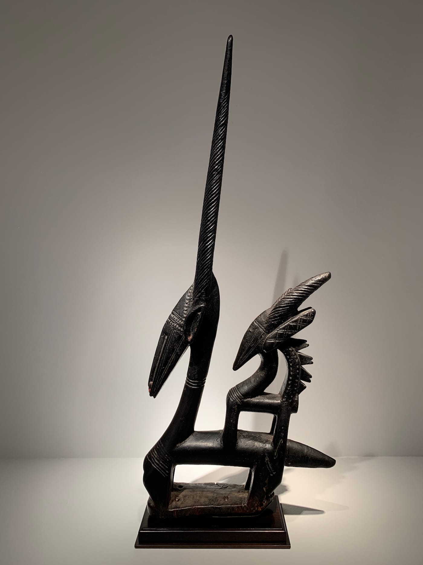 Galerie Bernard Dulon is exhibiting a series of cultural objects from Africa, including an elegant female antelope headdress from the 19th century. The wooden artifact hails from the Chi Wara Society in Mali and bears a provenance that dates back to the 1950s. But other objects have a startling dearth of information. An Ivory Coast sculpture of a female figure from the late nineteenth century? “Private Collection, Brussels.” A divination box from the Democratic Republic of the Congo? “Private Collection, Paris.” Months after France’s landmark restitution report, this lack of detail was troubling. A gallery representative that I spoke to described how repatriation will affect the antiquities business as still “an open question.” And when I inquired about the history behind the antelope headdress, she began discussing how Picasso developed cubism from African aesthetics.