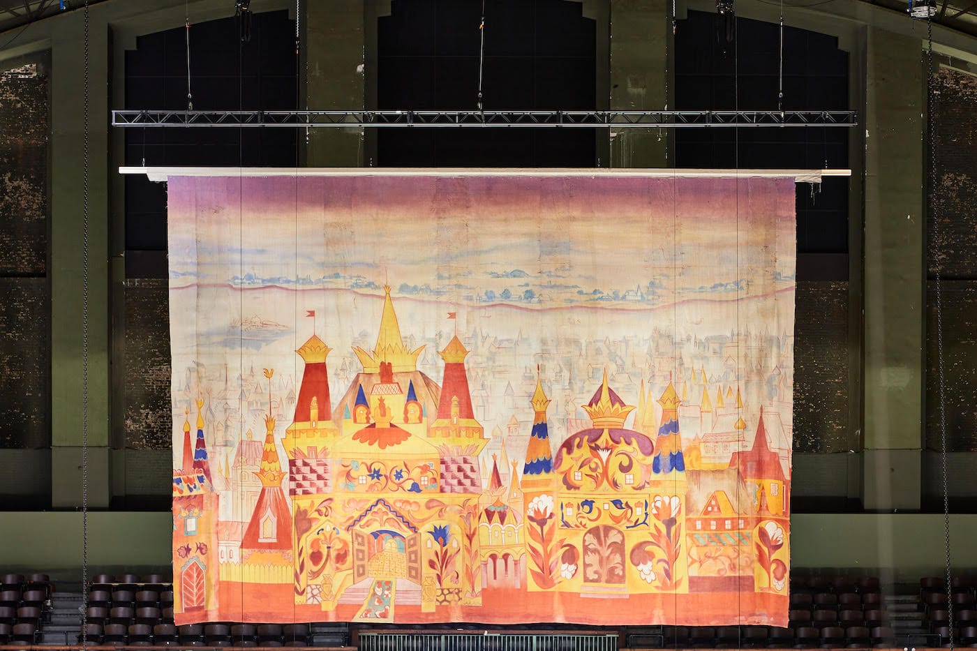 I would be remiss not to mention the enormous scenographic backdrop hanging above everyone’s heads in the drill hall. This technicolor curtain is the creation of the Russian avant-gardist Natalia Goncharova for the 1914 Ballets Russes production of Le Coq d’Or, here presented by Galerie Gmurzynska. The work is opulence par excellence drenched in shades of vermillion, yellow, and purple. Created almost a year after Igor Stravinsky’s iconoclastic Rite of Spring, Goncharova’s designs continue the trend of Russian arts returning to peasant traditions and regional aesthetics.