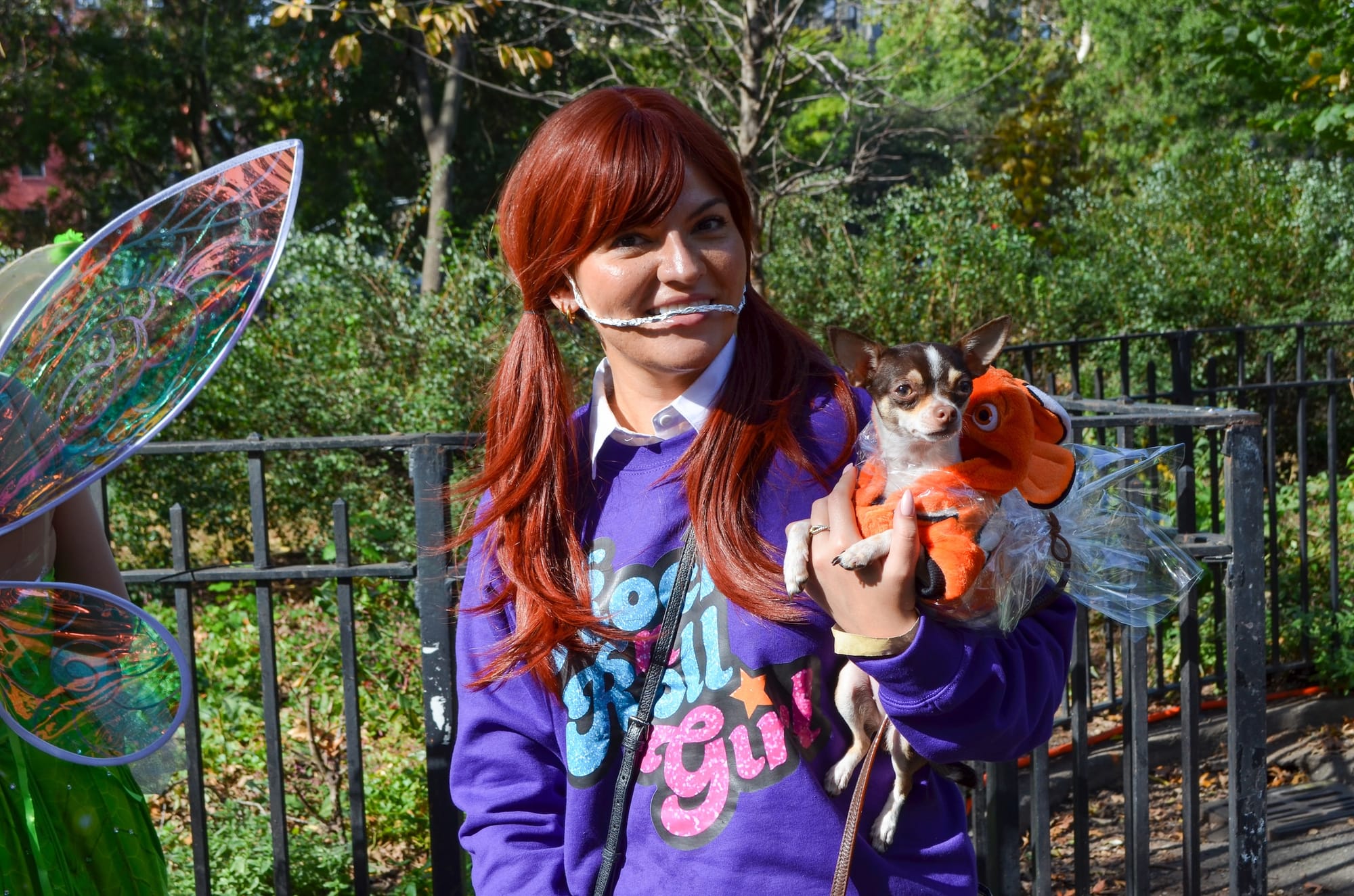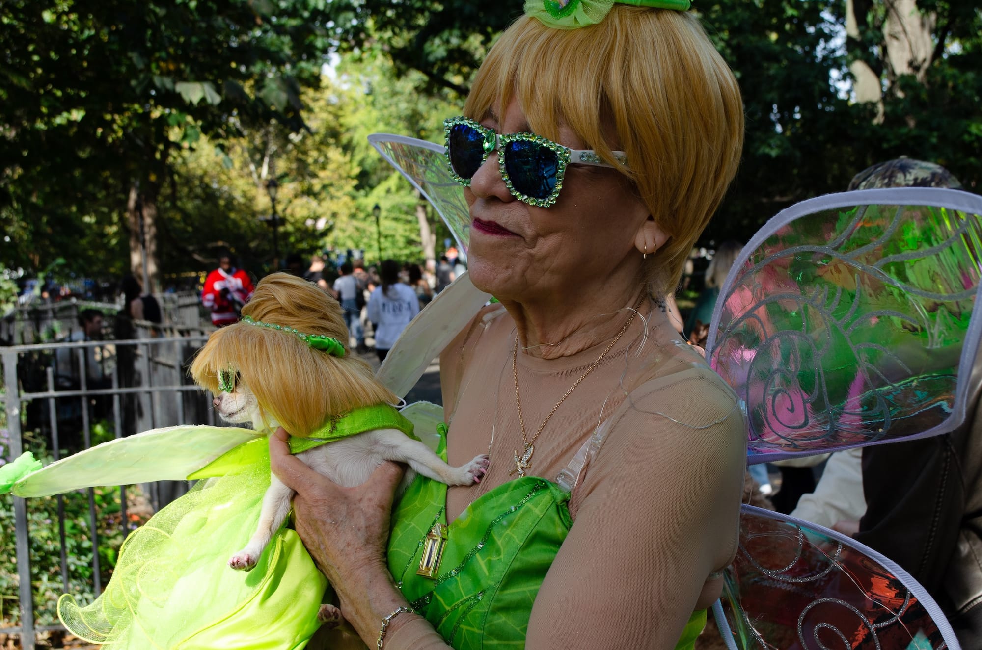 Among the dogs (and their owners) who spoke to Hyperallergic was Martini "Tini" and owner Araceli dressed as Darla and Nemo from Finding Nemo (2003). Araceli said this was their first dog parade, as Tini the Chihuhaua had just turned one year old. The duo came in a group called the Chihuahua Society NYC, and nearby, another toy dog dressed as Tinkerbell captured the attention of every nearby camera owner.