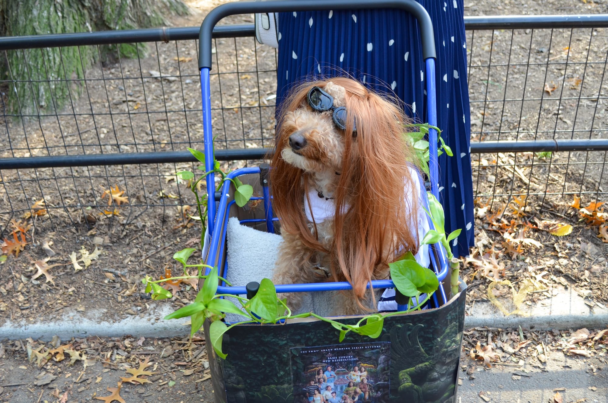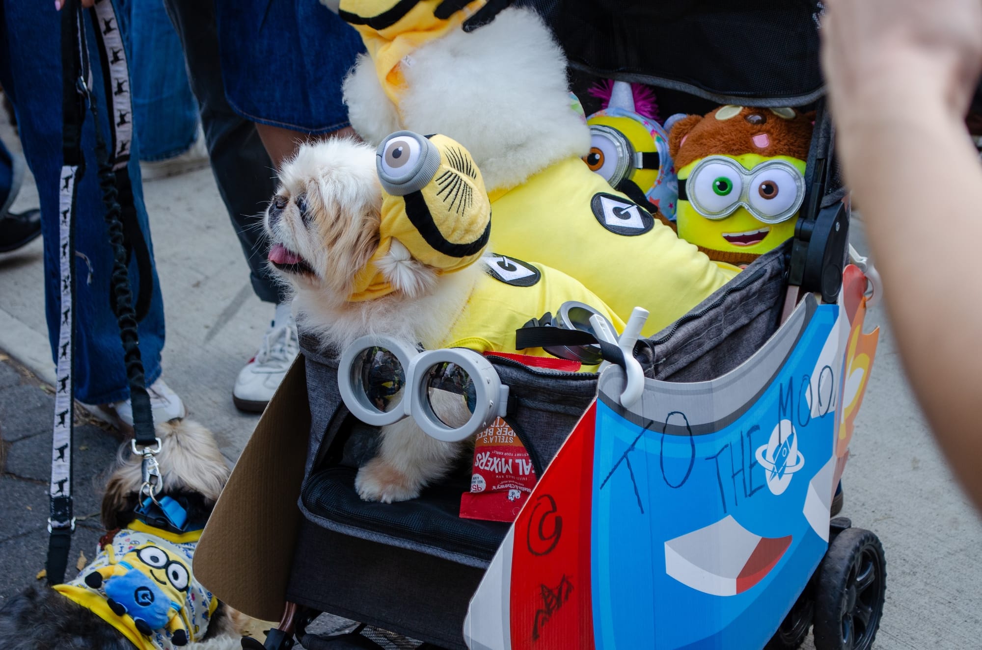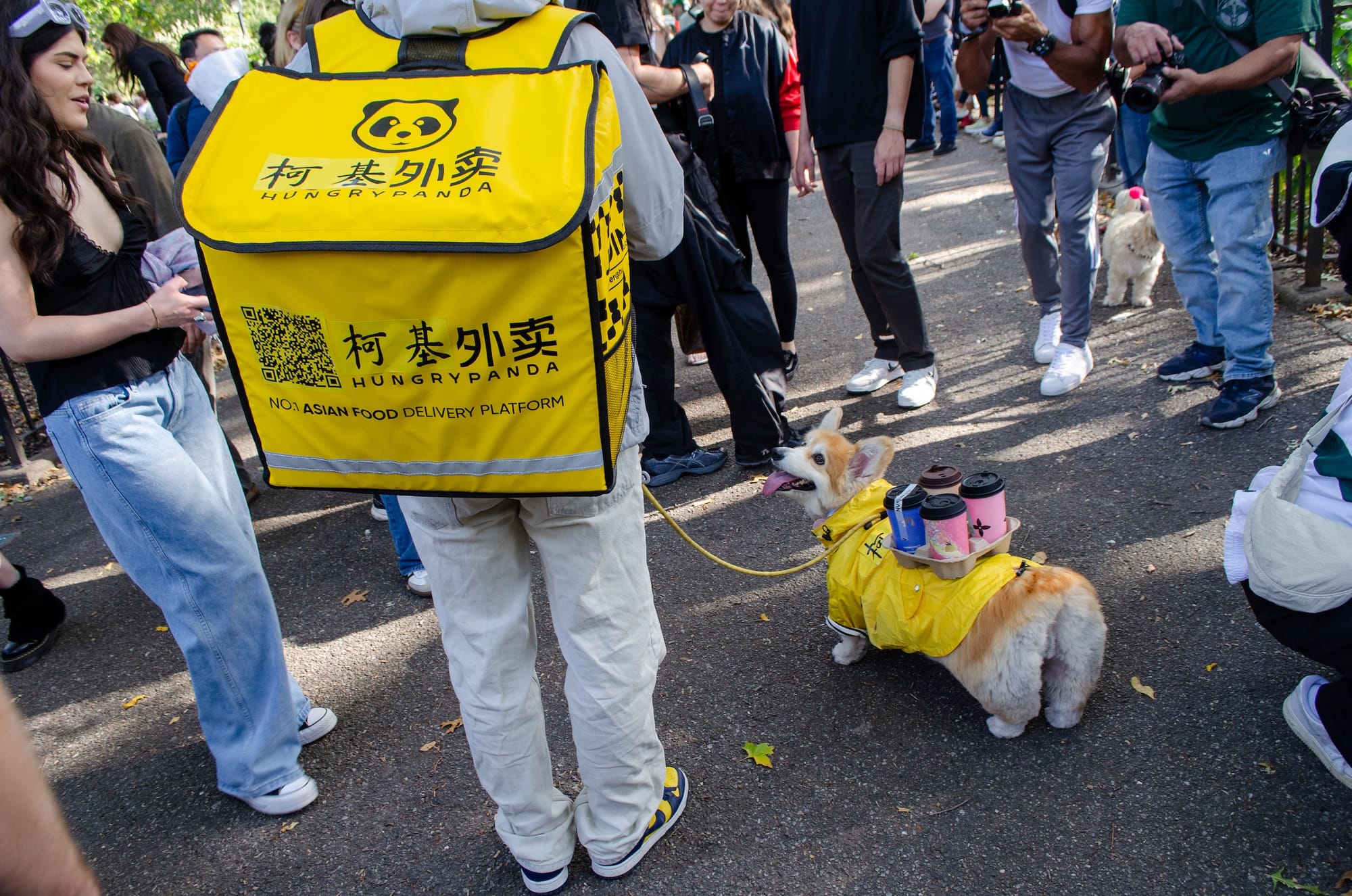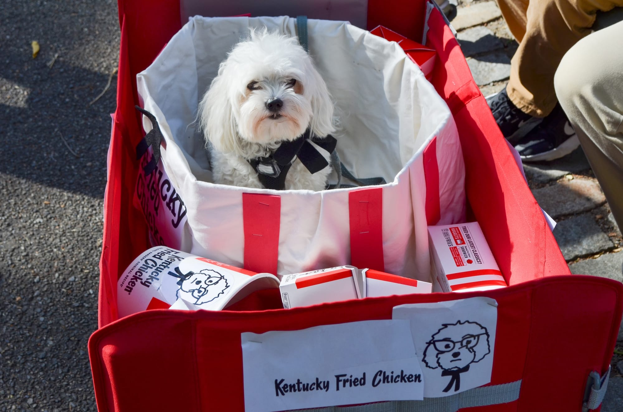 A dog named Bagel was dressed as Piper from Season 3 of The White Lotus Season, and another, named Coby, came as a Sim from the eponymous computer game. Sara, Avi, RJ, and their dog Bon Bon were in Kentucky Fried Chicken franchise theme. Dogs also appeared to serve as unusual vectors for advertisement, including a corgi dressed as a delivery worker for the app Hungry Panda.