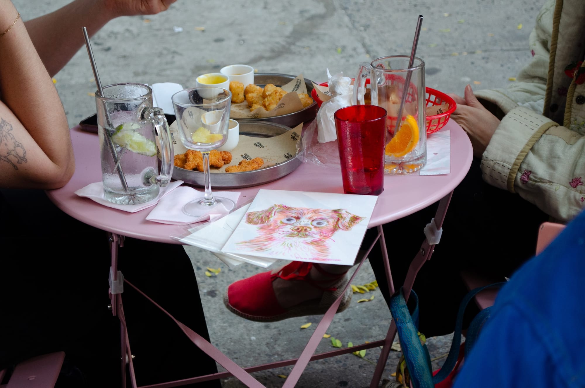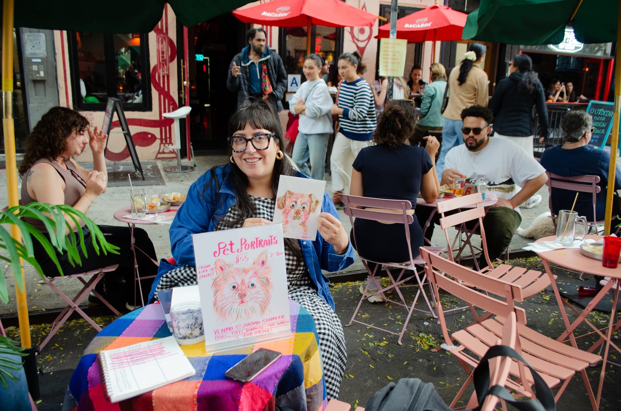 Sitting at Romeo's, a bar not far from the park, Brooklyn-based illustrator Jordan Sondler drew pet portraits for $55 each. Sondler told Hyperallergic she "pops up all over the city" at events to draw mostly pets, and sometimes humans. She created eight portraits on Sunday. The crowds, she said, were "insane."