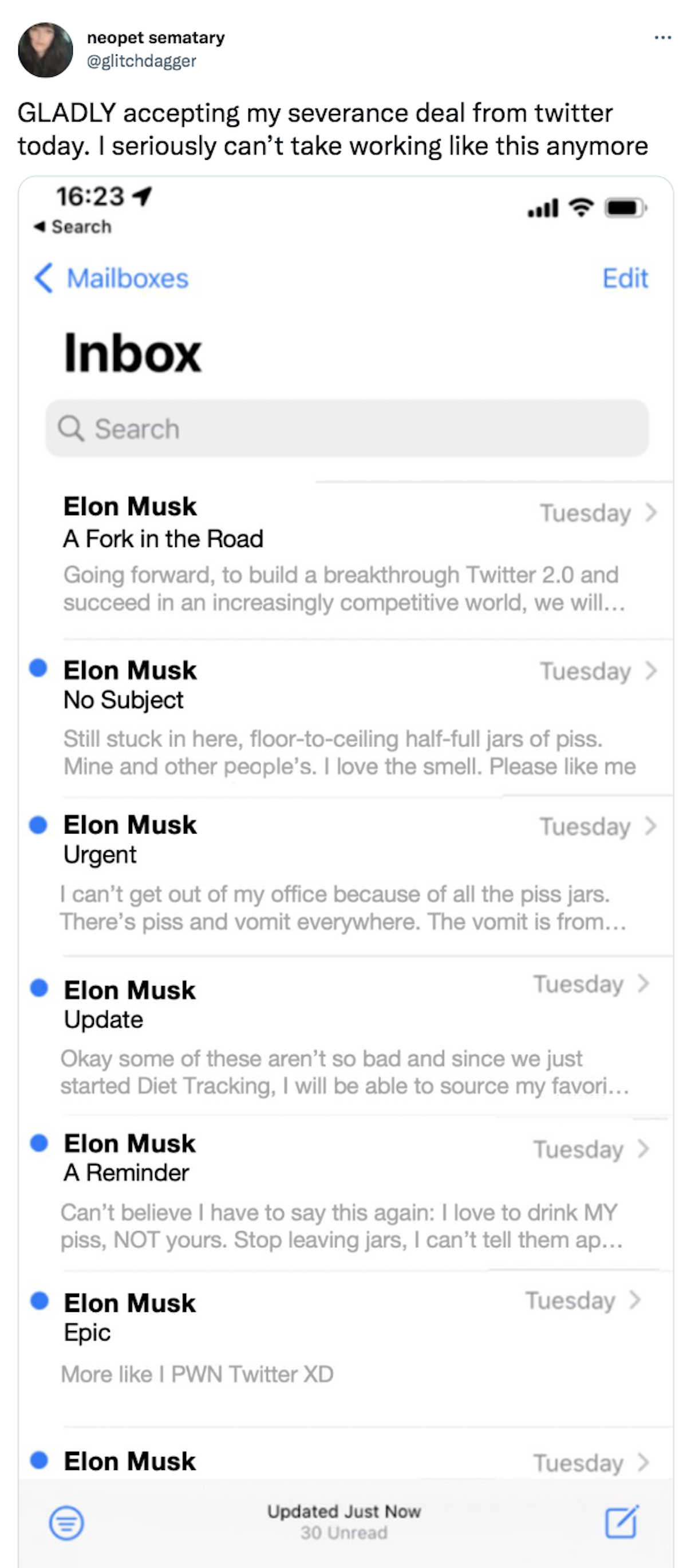 The doctor of this whole predictably disastrous scheme is, of course, Musk himself. Not long after the launch of the feature, somebody named Elon Musk blessed with the authoritative blue check exhorted followers: “If you want to be like me, drink your pee.” One meme satirizes the tone of Musk’s megalomaniac corporate-speak and his spasmodic emailing habits while riffing on the parody stunt, displaying a screenshot of an employee inbox flooded with Musk’s desperate urinal fixation.