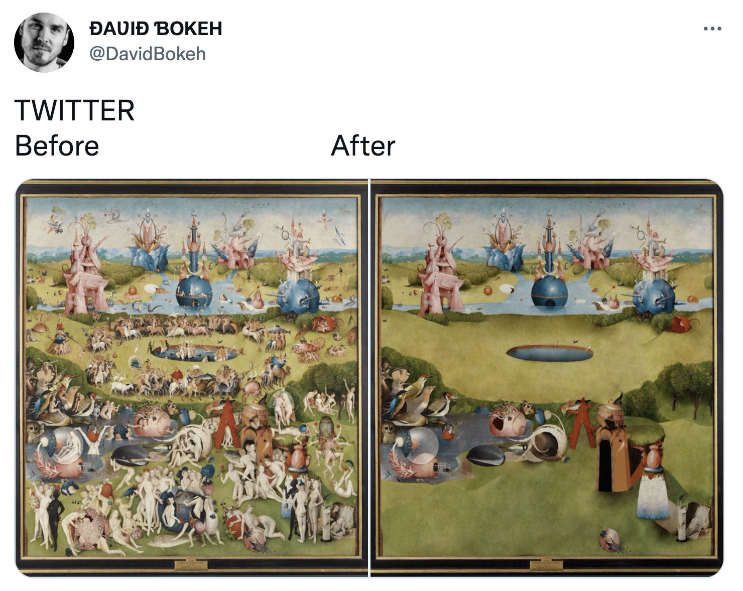 One Tweeter brilliantly invoked Hieronymus Bosch’s "The Garden of Earthly Delights" to sing the praises of the erstwhile hedonistic playground in virtual space. Captioned “Twitter: Before / After,” on the left is Bosch’s original central panel, full of strange delights and distractions and visual overstimulation; on the right is a digitally edited version of the painting removed of all its pleasure-seeking human subjects. Sure, the new scene looks serene, but Bosch’s place in art history was hard-won by his meticulous dedication to orgiastic excess — something we are on the brink of losing as Twitter holds on for dear life.