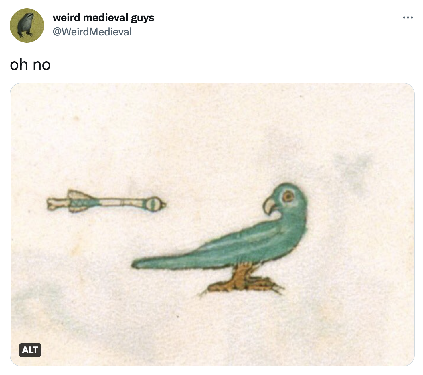 And someone who has definitely been spending way too much time in the archives of the British Library posted a drawing of a bluebird getting shot by an incoming arrow that appears in the margins of a medieval manuscript.