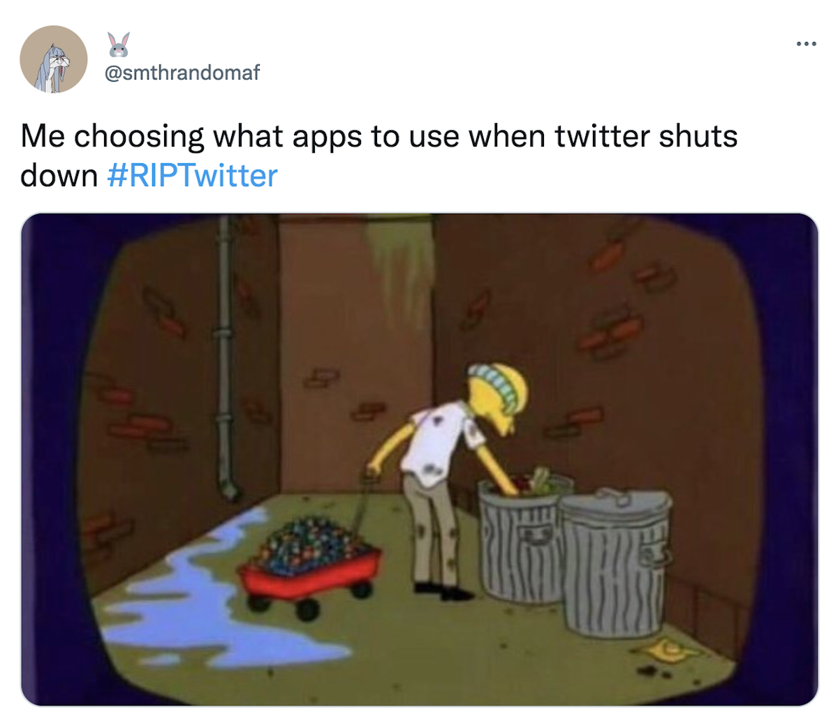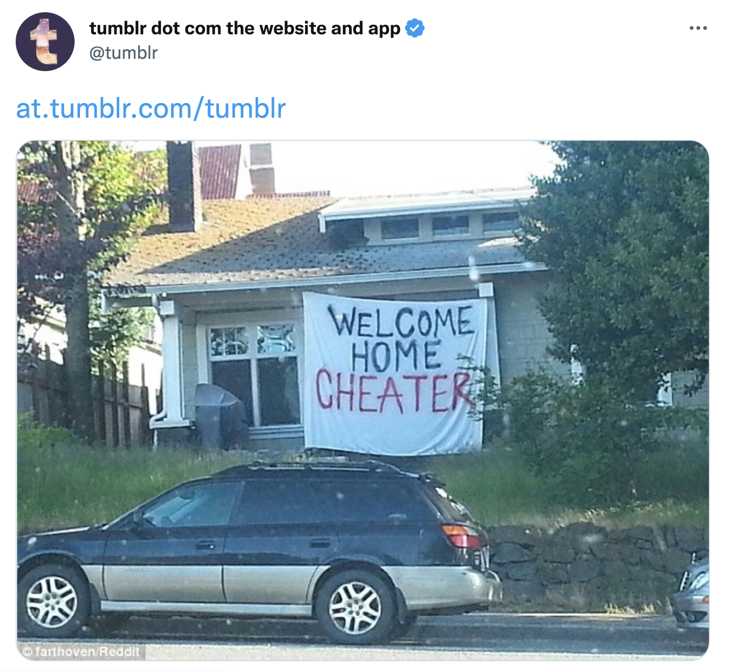 Several memes poke fun at the opening that Twitter’s collapse presents for competing social media platforms like Instagram. (Outwardly, Instagram eulogized Twitter’s coup de grâce in what read like a drunk Tweet — "tbh we love twitter" — then promptly deleted it.) Meanwhile, Tumblr is playing offense, reposting a photo of a house draped with a sheet spray-painted “Welcome Home Cheater” in all caps with a link to its own site. (That being said, this morning, Tumblr went down, likely in response to a surge in visitorship — so it might not yet be a real viable alternative.) Someone floated out Pinterest as another contender; sorry, but that’s never happening for me.