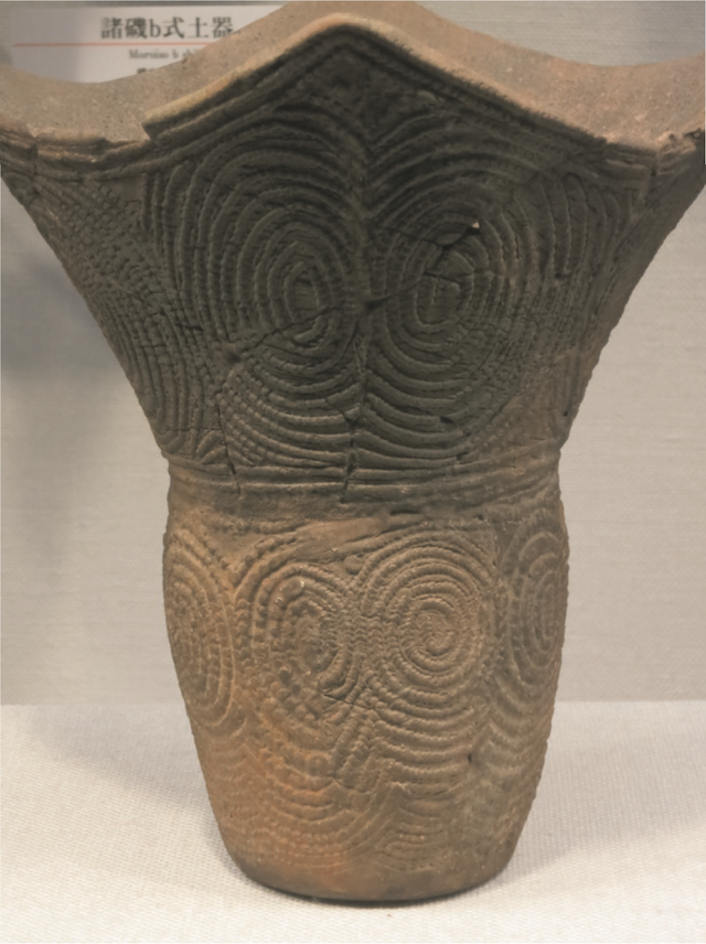This is one of the artworks cited by the authors, a pot “covered with various spiral patterns … This particular style of vessel, known as Moroiso, was made around 4000 BC by people of the Jomon culture, a relatively peaceful and non-stratified society of prehistoric Japan.” (Photo taken by Tom Froese at the Archaeological Museum of Kokugakuin University, Tokyo, Japan, via the paper)