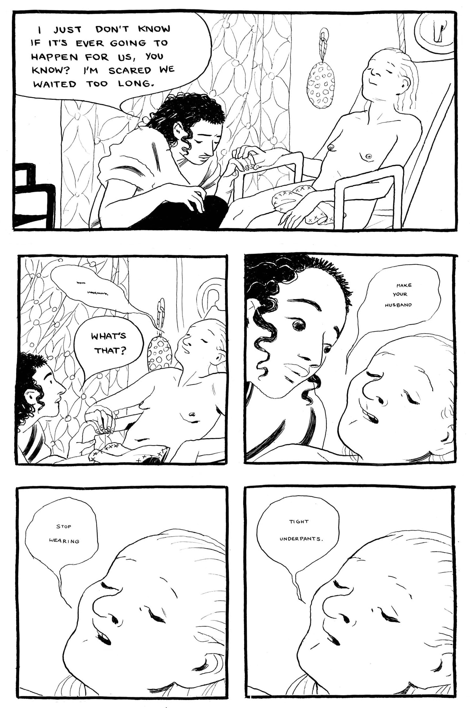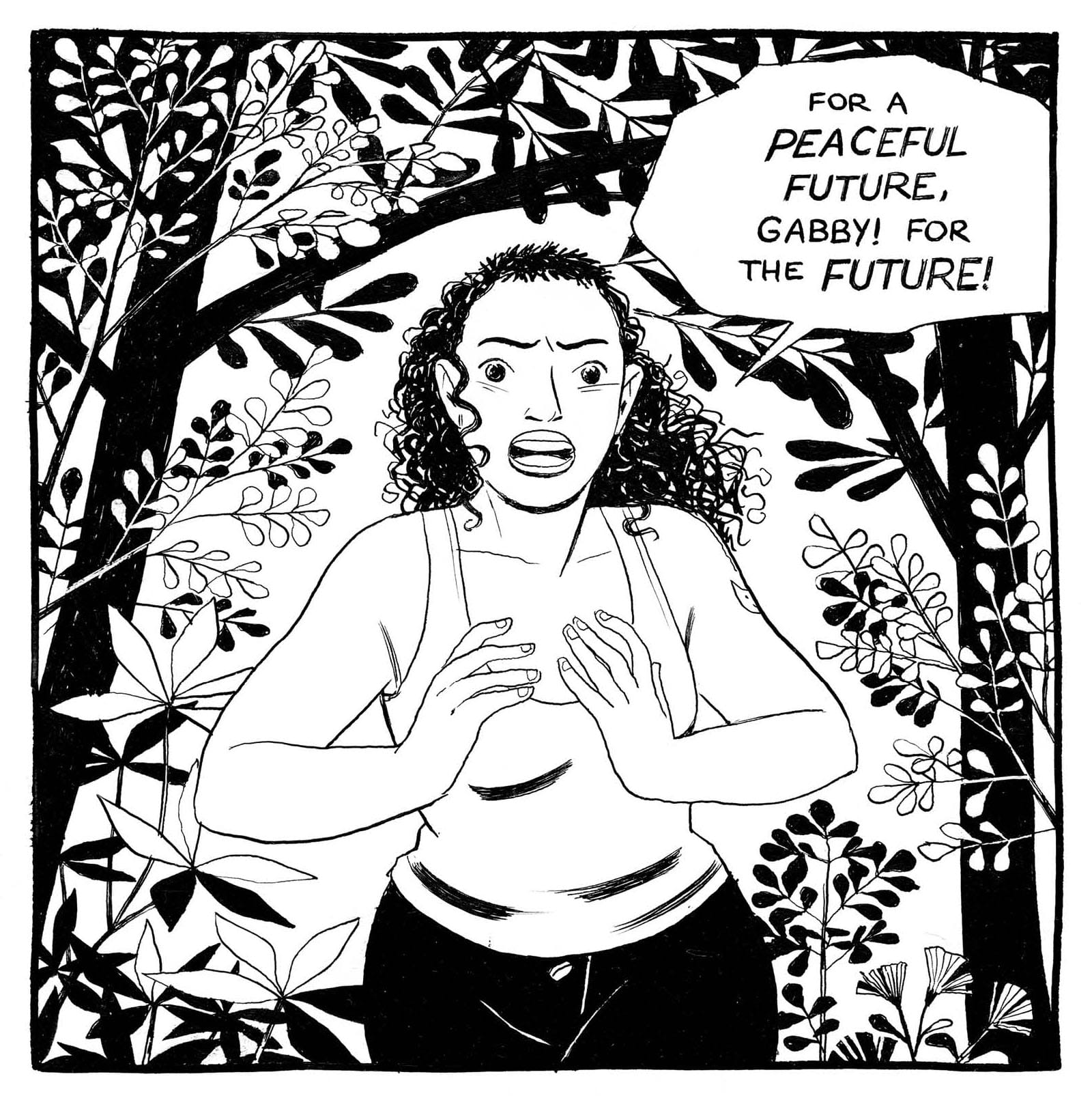 The world of The Hard Tomorrow is our own, but set in an unspecified future and just slightly worse in every respect. Mark Zuckerberg is president, it’s possible for one’s citizenship to be revoked by the government, and new anti-protest legislation has classified megaphones as “criminal instruments.” Blight threatens to drive oak trees to extinction within a few years. Passionate activist Hannah somehow manages to keep her optimism in the midst of all this, explicitly symbolized by her dogged efforts to conceive a child with her husband Johnny. The couple live out of their truck on the land Johnny is supposed to be building them a house on, though he continually delays progress in favor of getting high and trying to cultivate an “apocalypse garden.”