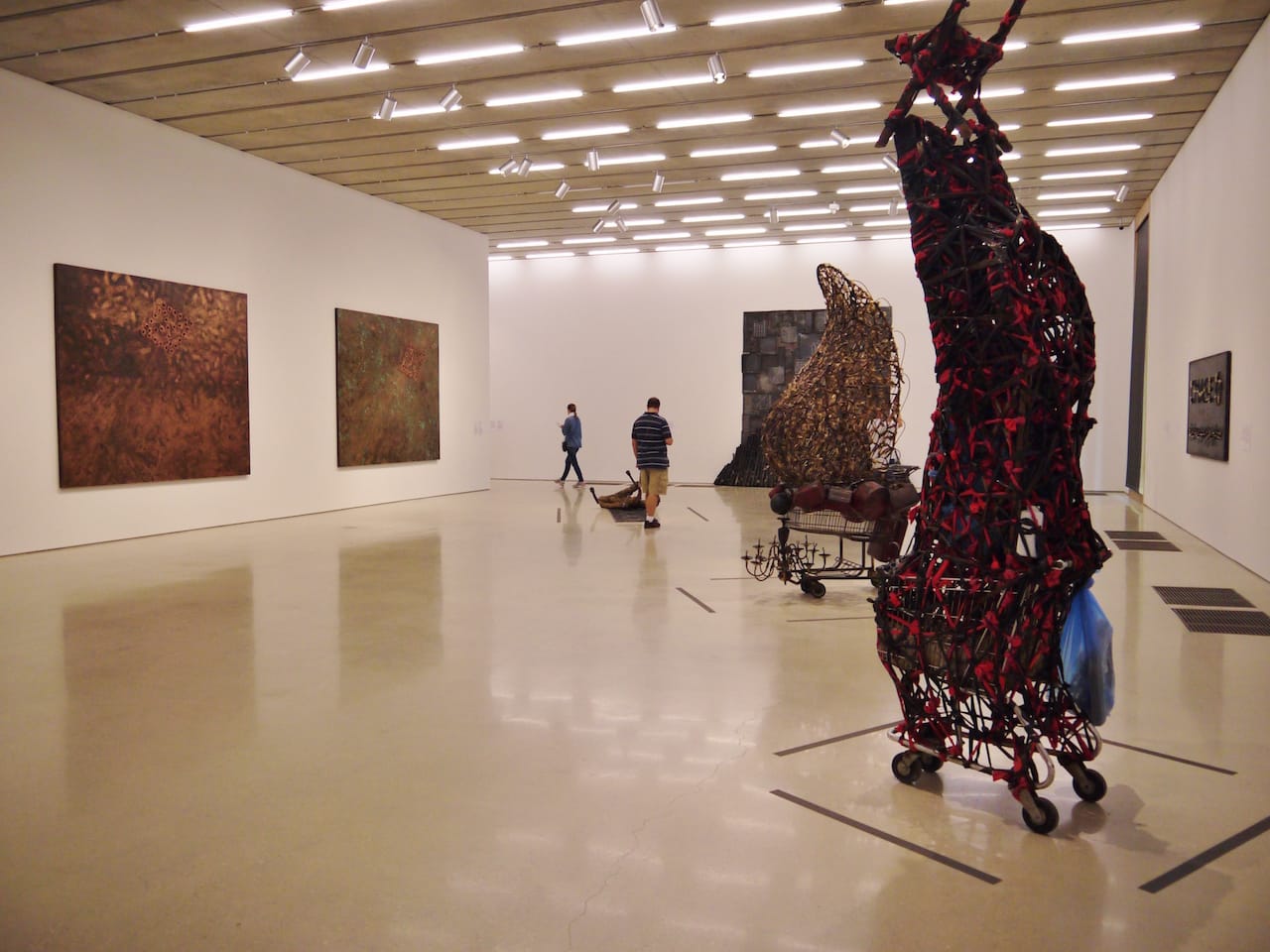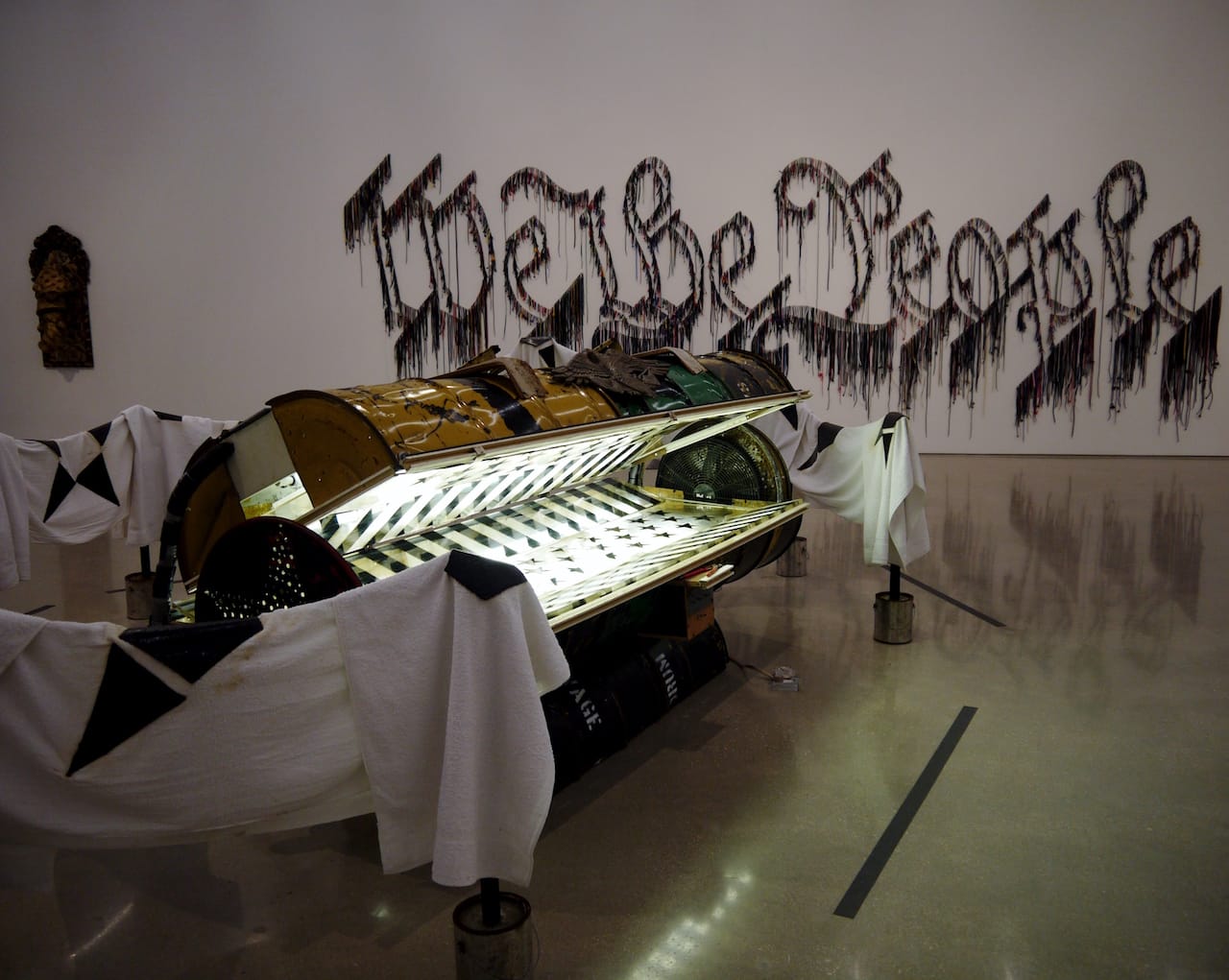 Take, for example, “Savior” (1996), a sculpted tower built up from a found shopping cart. The top of it rises like a spire and is made out of literal junk: trashcans, bottles, fence latticing. Symbolically, the piece resembles a Christian cathedral or church, but its materiality strongly whiffs of the makeshift carriages that homeless travelers or gypsies fashion from things society no longer finds valuable, or holy. Another installation, “Glory” (2004) is a composite structure tacked together with imagery and materials of different cultures: an audio recording of a parrot learning English reverberates around a half-open tanning bed, which is lit and starkly highlights the surrounding oil barrels engraved with the US flag. (It’s noted that the piece was made a year after the United States invaded Iraq.)
