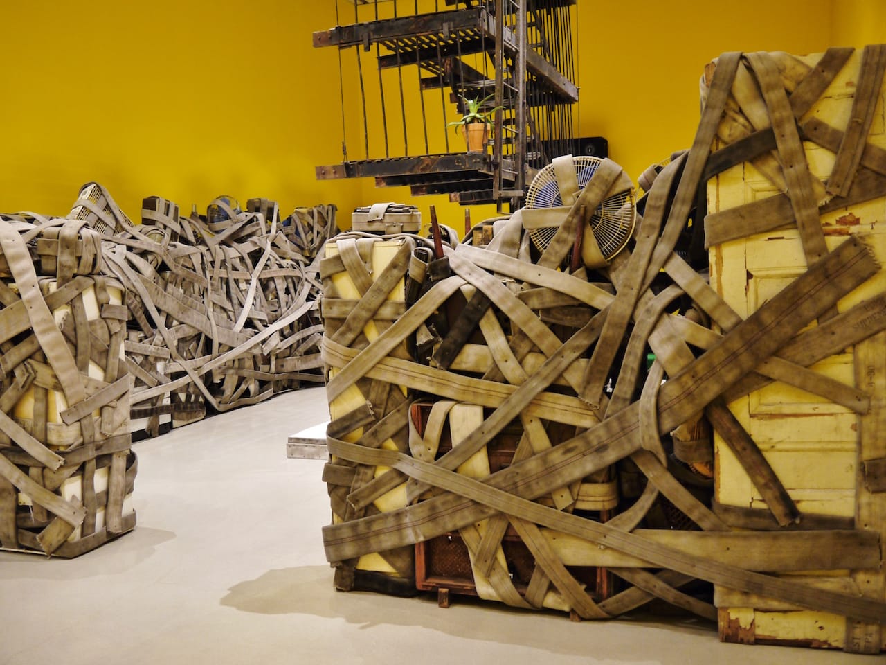 You’d expect guns, or mentions of negative associations with black culture. Instead, Ward references tourist organizations’ tendencies to paper over trauma with fantastical narratives. The title of the exhibit, Sun Splashed, references a reggae festival popular in Jamaica, but also implies how Caribbean hotspots are falsely advertised as always happy and sunny. The exhibition opens with the bold and vaguely sarcastic installation, “Happy Smilers: Duty Free Shopping” (1996), which occupies an entire room. A facsimile storefront, inspired by a real gambling den in Harlem that fronted as a candy store, invites bystanders to walk under its bright yellow awning from which soda bottles sway as if charmed by an imaginary Caribbean breeze. Soft chatter, music, and laughter loop on a soundtrack. Once inside the installation itself, however, the audio switches to rain on a rooftop. A fire escape hangs in the center of the yellow-painted space, partially surrounded by barricades of domestic objects: electric fans, vacuum cleaners, and radios strapped together by long, tight meters of fire hose. The kinetic tension — the objects are supported by rope, the fire escape suspended from the ceiling — in this piece dictates a theme of complex binaries and juxtapositions apparent in Ward’s oeuvre. Forces that oppose each other also disturbingly complement each other, a consideration he weaves into his commentary on social and judicial ecosystems.