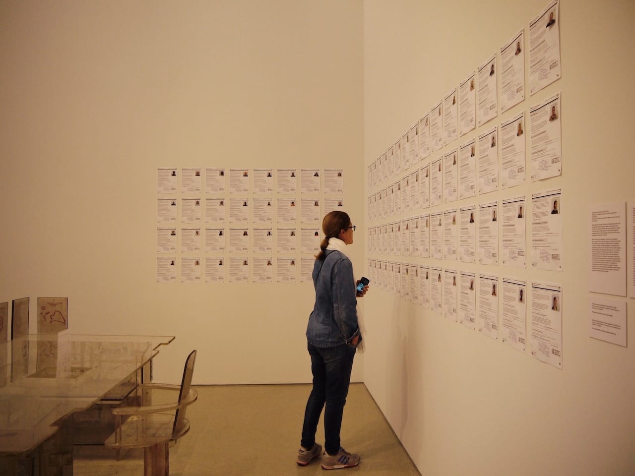 The identity conflicts are clearest in Ward’s artistic homages. A wall of photographs, depicting African American kids from the 1950s or ‘60s, reveal inked silhouettes which allude to and are in solidarity with Kara Walker and Norman Rockwell’s black expression. In “Naturalization Drawing Table” (2004), viewers are encouraged to have their profiles snapped and fill out immigration forms (although only on specific open days set by PAMM), which will then be stuck up on the wall as part of the piece. This clinical spread of forms and photographs heavily references Taryn Simon’s photo essays, which also observe social customs and rejections, showing that a person’s fate is often dictated by random regulations more than anything else.