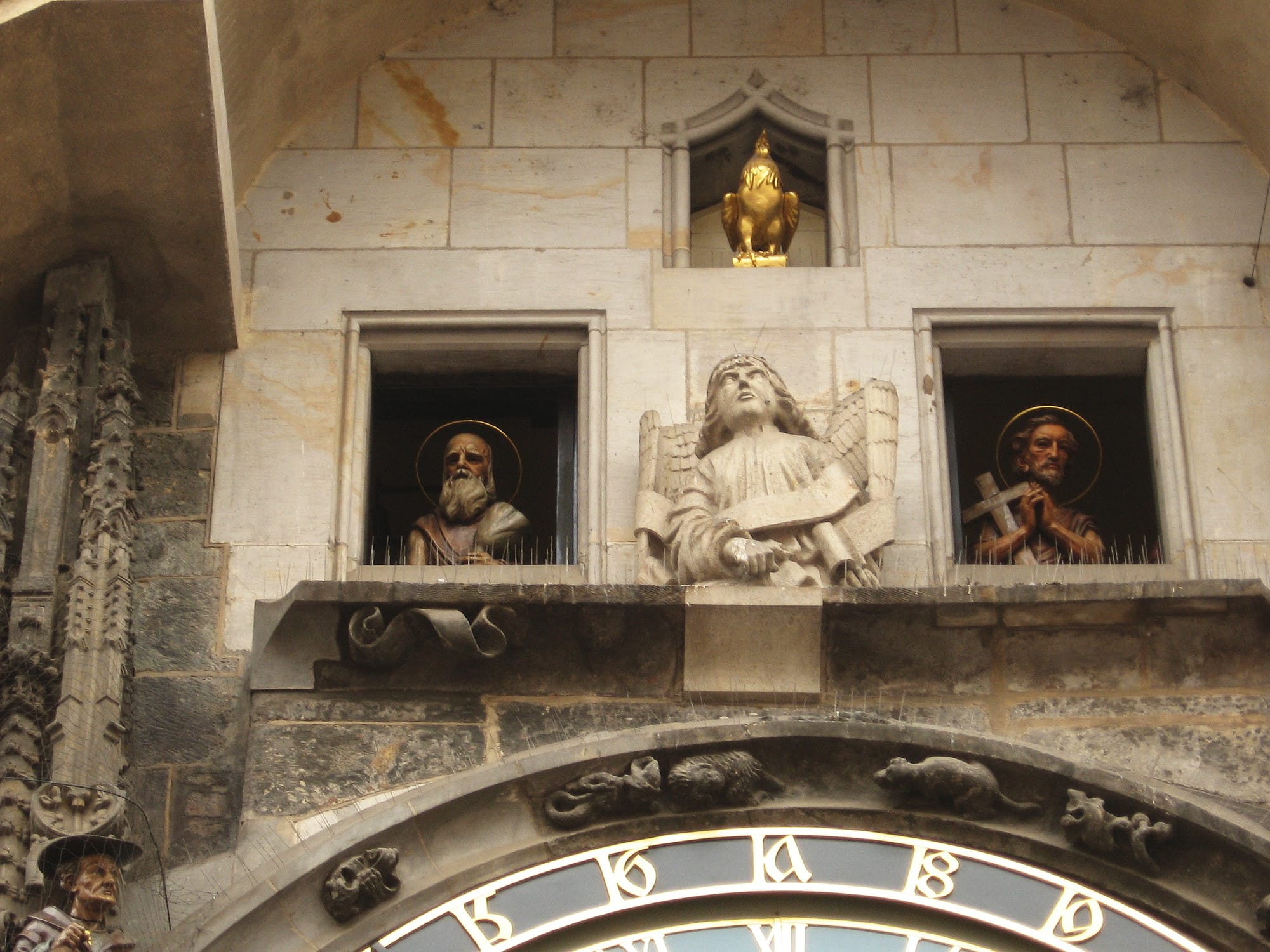 Today, the most popular — let’s face it, the most accessible — aspect of the Orloj is its animated decorations. Every day right before noon, hoards of people gather in front of the clock and wait for it to strike, at which time sculptures of the Twelve Apostles take turns peeking through two windows at the top of the clock. Below them, a skeleton representing death pulls a bell, while the three figures of the miser, vanity, and “the Turk”— remember, much of Central and Eastern Europe was once ruled by the Ottoman Empire — nod to each other in a kind of morbid understanding.