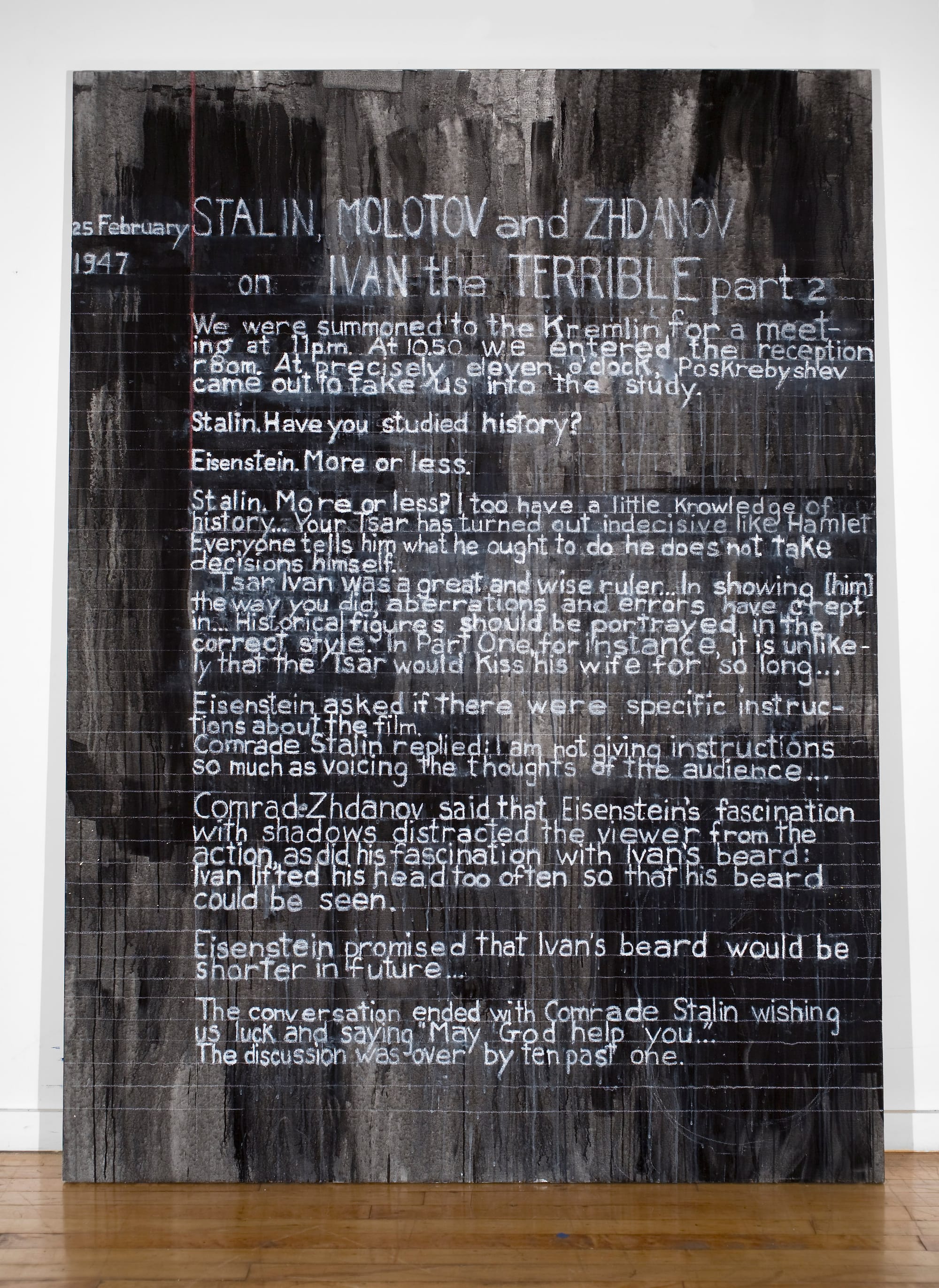 The pettiness to Stalin’s complaints about the film is chilling. In white letters on a black, washy ground in the painting, we read this statement by Stalin: “In Part One, for instance, it is unlikely that the Tsar would kiss his wife for so long…” Doesn’t this small-minded, humorless comment strike a chord? Who else have we heard talking like this in public, to many eager listeners? Meanwhile, as the painting further recounts, “Comrade Zhdanov said that Eisenstein’s fascination with shadows distracted the viewer from the action, as did his fascination with Ivan’s beard: Ivan lifted his head too often so that his beard could be seen.”
