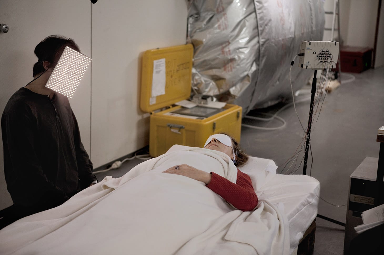 If The Host and the Cloud — a perplexing film by French multimedia artist Pierre Huyghe that has played in various contexts since its debut in 2010 at the Marian Goodman Gallery in Manhattan — concerns itself with anything specifically, it is with preparation. Its characters are forever assembling, arranging, moving into place across frames and rooms, making ready for events. These events include a terrorism trial, a hypnosis session, and an address by a state leader speaking to a mostly empty hall, but they captivate less than scenes of people rustling them up: donning costumes and headwear, hauling bodies and props into position. All this arranging and getting set produces a surprising sense of solemnity and importance.