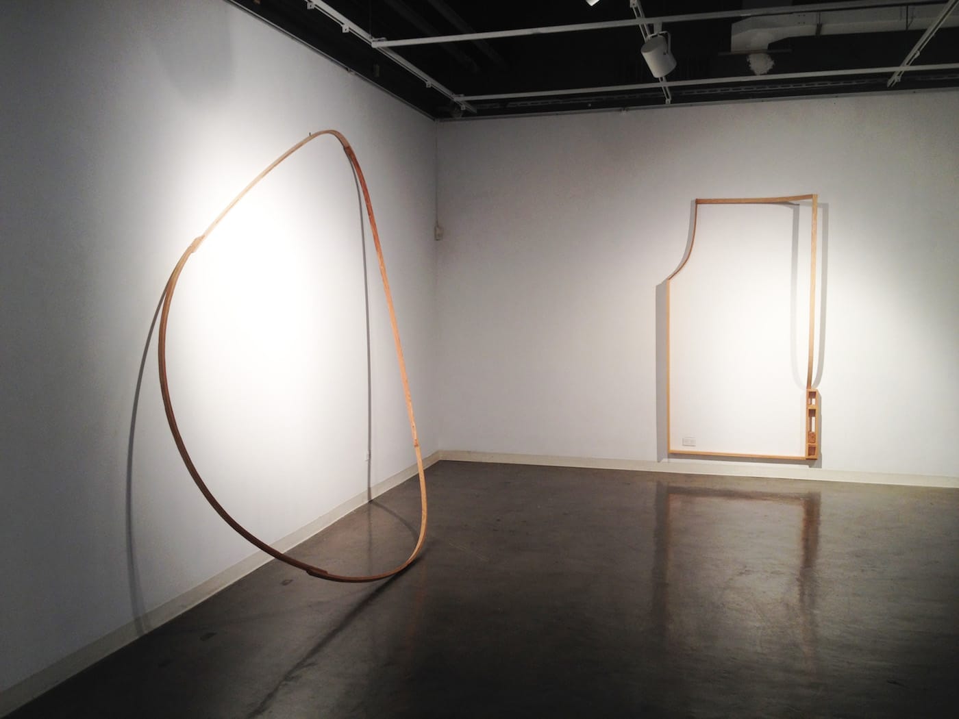 A great loop of spliced wood strips, some ten feet across, “Untitled (Oval)” (2007) rests on the floor and leans — or rather, lolls — against the wall, as if it had just rolled in from out of town. In “Untitled (The Shape of Sound)” (2002), an otherwise unadorned 10-foot-wide rectangle of wood supports a loose, vaguely wreath-like tangle of nailed-together slats, a bristling form that harks back to Leigh’s freestanding sculptures of the 1960s.