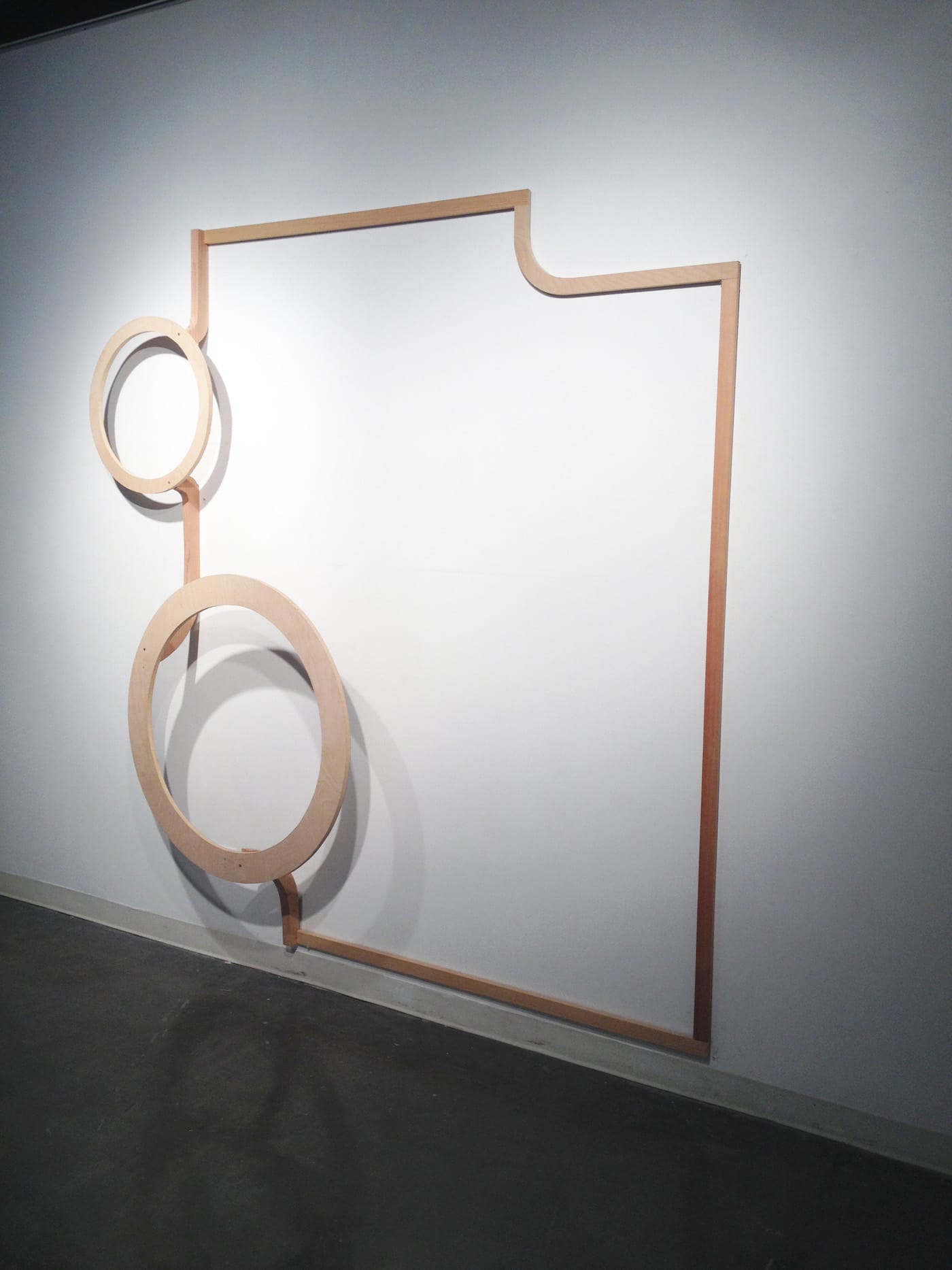 The wall works repurpose the artist’s long-standing concerns with architectural forms and scale alongside the pictorial space of painting. “Untitled” (2003), at three-and-a-half by four feet the smallest work in the Wallace Gallery show, has the look of both a floor plan and an eccentric window frame, complete with two bricks bolted to its outside edge. The allusion to a frame in “Untitled” (2004) is tweaked a bit with concave interruptions to the top right and lower left corners. On this armature, two plywood rings of differing sizes occupy different planes parallel to the wall, in an achromatic, three-dimensional echo of painting’s spatial illusionism. The bottom edge of many of these larger works hangs just a few inches from the floor, so that despite their expansive scale they seem vulnerable somehow, their relation to the viewer intimate.