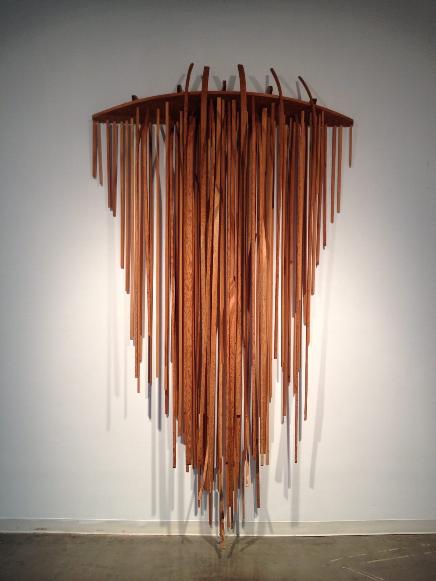 More deliberately grand in effect is “Untitled (Cascade)” (1992-96), an atypical if undeniably photogenic work that appears in the exhibition’s publicity materials. Made of strips descending vertically from a ledge-like protrusion overhead and tapering to a V shape, it does indeed somewhat resemble a waterfall — or cluster of stalactites, or Rapunzel having let down her hair. Opposite hangs the predominantly linear, roughly triangular “Untitled” (2007), of which (most of) the horizontal top side fits tightly against the wall while the other two, arcing sides converge at the bottom corner, a sharply acute angle that meets the wall. As impressive as “Cascade” is, its commanding presence is achieved through an abundance of materials; the 2007 piece, by contrast, does a lot with very little by compelling the viewer to examine every inch of it.