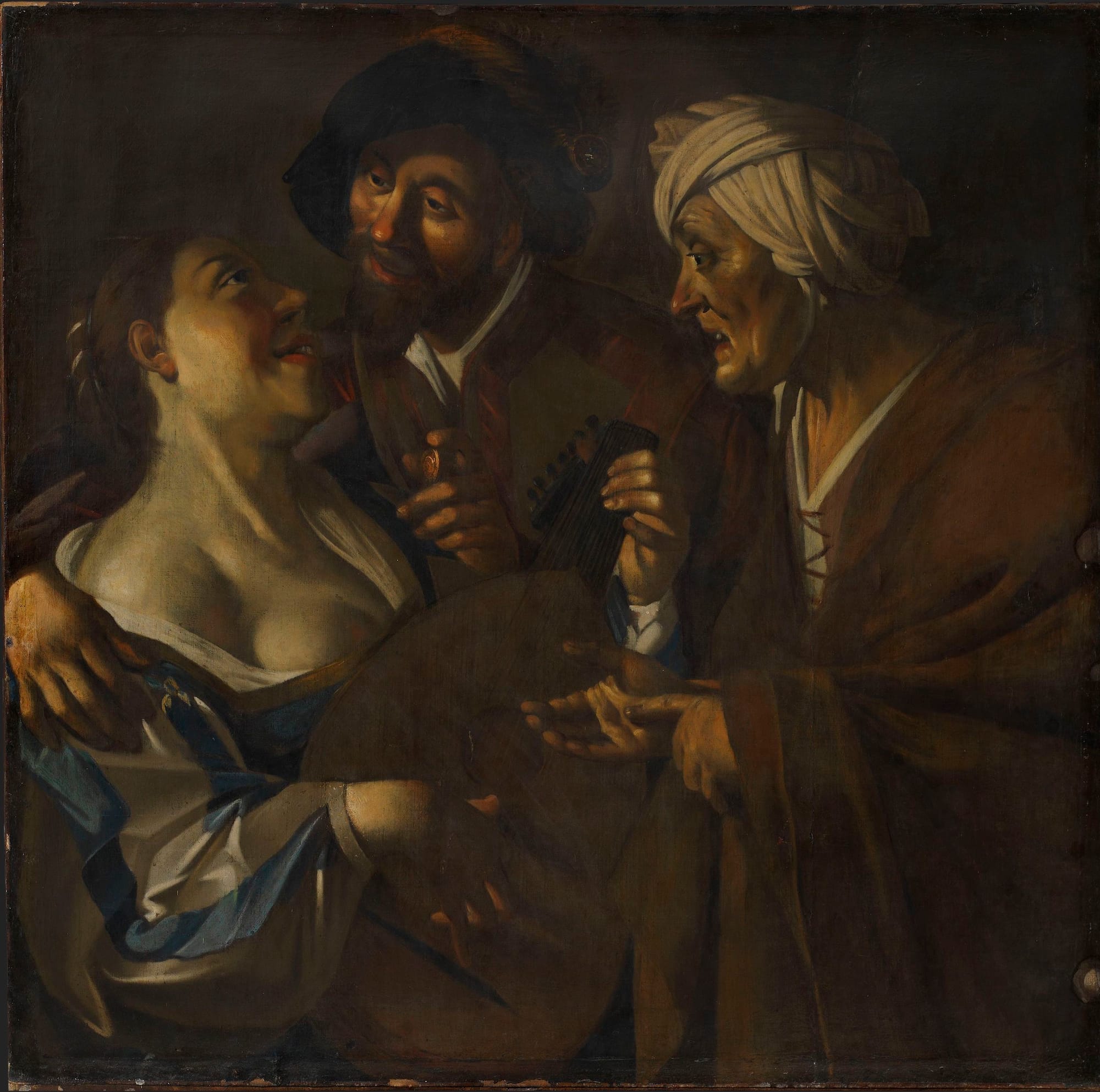 Some famous examples are on view. Han van Meegeren is best known for his forgeries of Vermeer, which he sold to the Nazis in the 1930s — a story ripe for dramatic effect, as seen fictionalized in the 2019 film The Last Vermeer. The Courtauld holds his copy of Dirck van Baburen’s “The Procuress” (1594–1625; original is in the Museum of Fine Arts, Boston), which was already known as a forgery when it was passed to lecturer Geoffrey Webb by a colleague so students could examine van Meegeren's various creative techniques, such as incorporating Bakelite into the painting and baking it to harden the surface. In another demonstration of how important close physical examination is to investigation, visitors can clearly see the canvas warping and buckling away from its frame in a manner unlike what you would expect from sturdier 17th-century Dutch works. Flat photographic reproductions do not allow the viewing angles by which this is revealed.