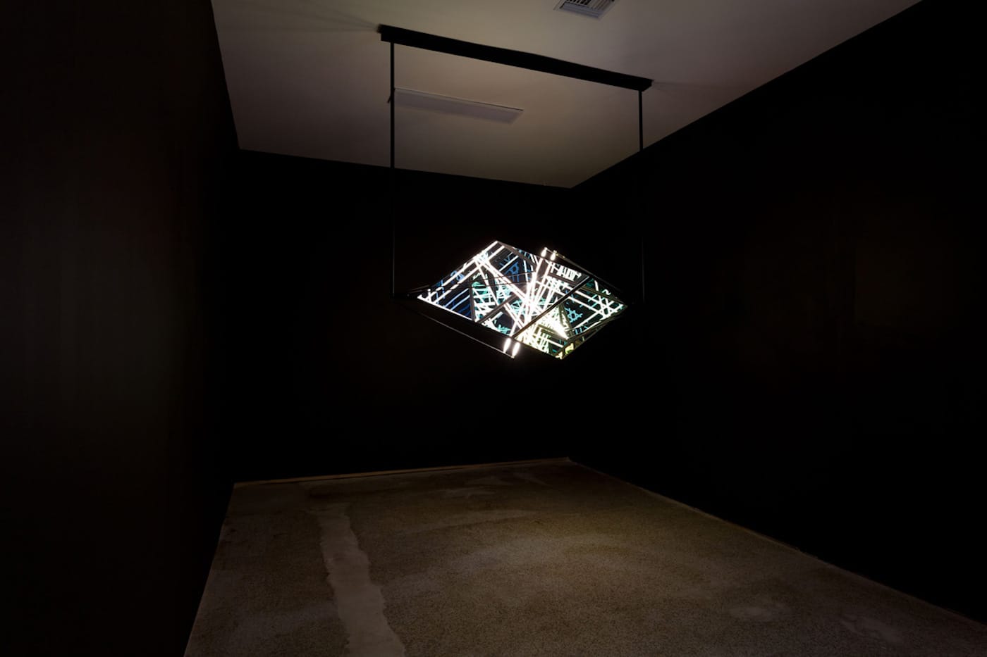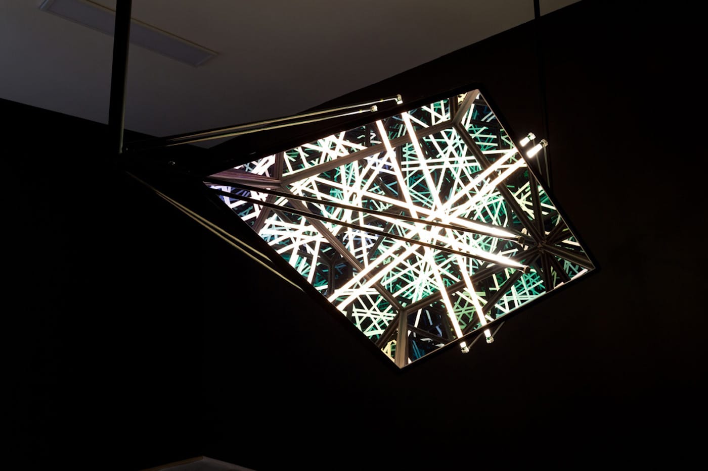 But the limitlessness persists. One piece, for which the exhibition is named, is in a blackened room. It hangs from the ceiling like a monolith and, at a distance, has the visual effect of sempiternity: a morass of rainbow tubing emerges from the darkness, endless not like a tunnel, but like a portal. It’s set at eye level, a diamond-shaped hunk of mirrors and yellowish bulbs that, in their repeated reflections, travel down the spectrum and become greenish, then blue, then purple.