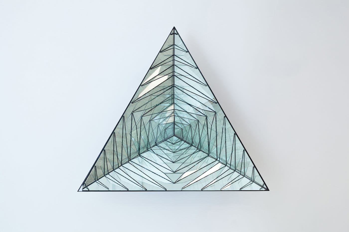MIAMI — Endless Light in an Endless Night, the title of Brookhart Jonquil’s compact and twinkling solo show at Emerson Dorsch, is misleading. Almost none of the eight works, comprised mostly of steel and silver, shining mirrors, and glass dense enough to look unbreakable, feel completely boundless. Mirrored pyramids on the wall, many-planed and layered thick with angled glass so that their internal reflections repeat themselves, only reference ceaselessness. While the light hits the pyramids prettily — you’d almost expect to hear a sound effect, given the glint — they provide no clear reflection of the viewer. Their infinity is less endless than contained.