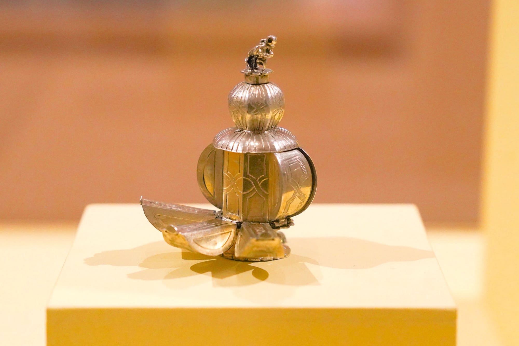 Designated by color-coded walls painted in a palette of cake-frosting hues, the show is organized into six sections, or “episodes,” according to theme: definition of miniatures, world exploration, home, jewelry and adornments, portraits of people and animals, and spirituality and mourning. The featured objects are displayed on pedestals or set into walls, with windows. Visitors peer in and point out delightful details to one another in hushed voices, sometimes leaving the clear cases smudged in pursuit of a closer look. Across one wall, a video shows a selection of pieces at larger-than-life scale as a white-gloved hand demonstrates how some of the objects move, including an exquisite gilded silver pomander (c. 1580) that opens to reveal eight hinged, apple-wedge-shaped compartments, each etched with the name of the scent it once held.
