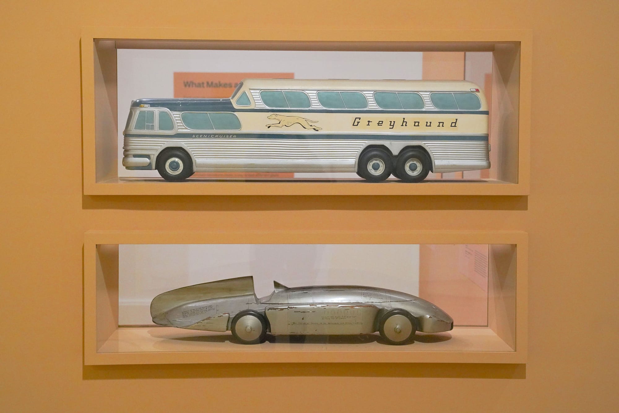 Opening with some brain-teasing wall text, the show establishes definitions: “Not all miniatures are small … And not all small objects are miniatures.” In other words, the sleek, 40-inch model of a 1950s Greyhound Scenicruiser might not be considered tiny when compared to, say, the half-inch, hedgehog-shaped Egyptian amulet that’s displayed nearby. But the model bus is smaller than its “parent” or “origin object,” a full-sized bus, and that’s what makes it a miniature.