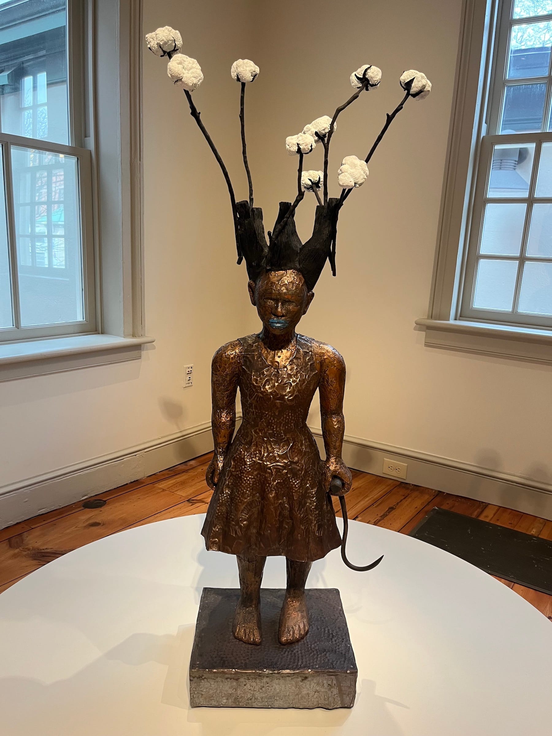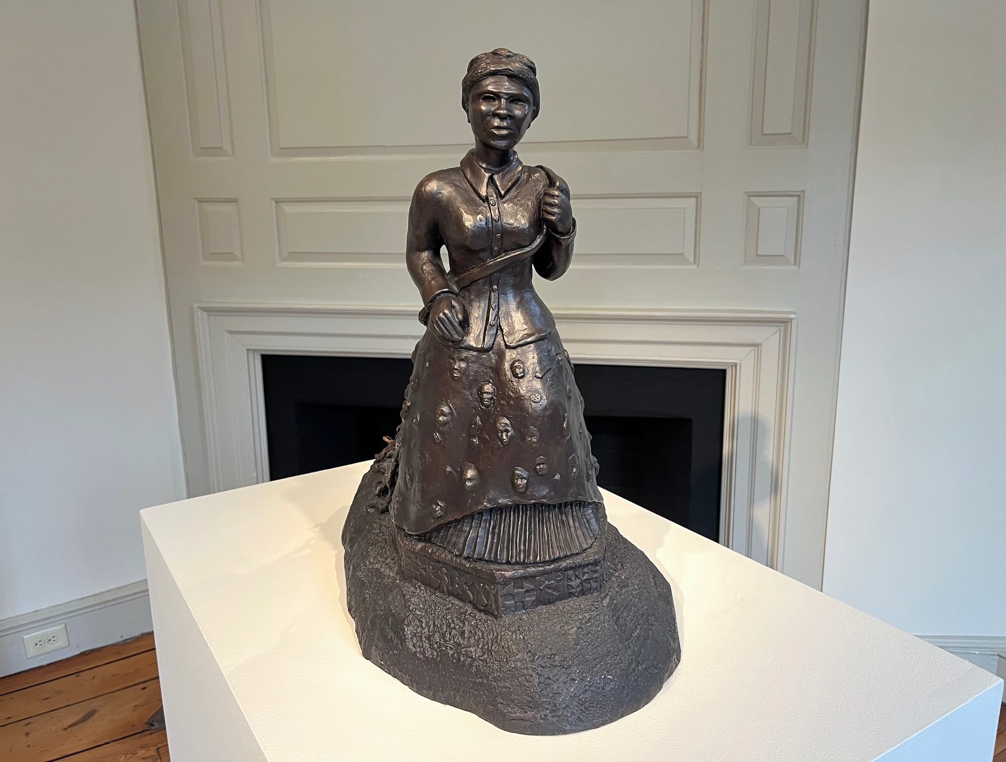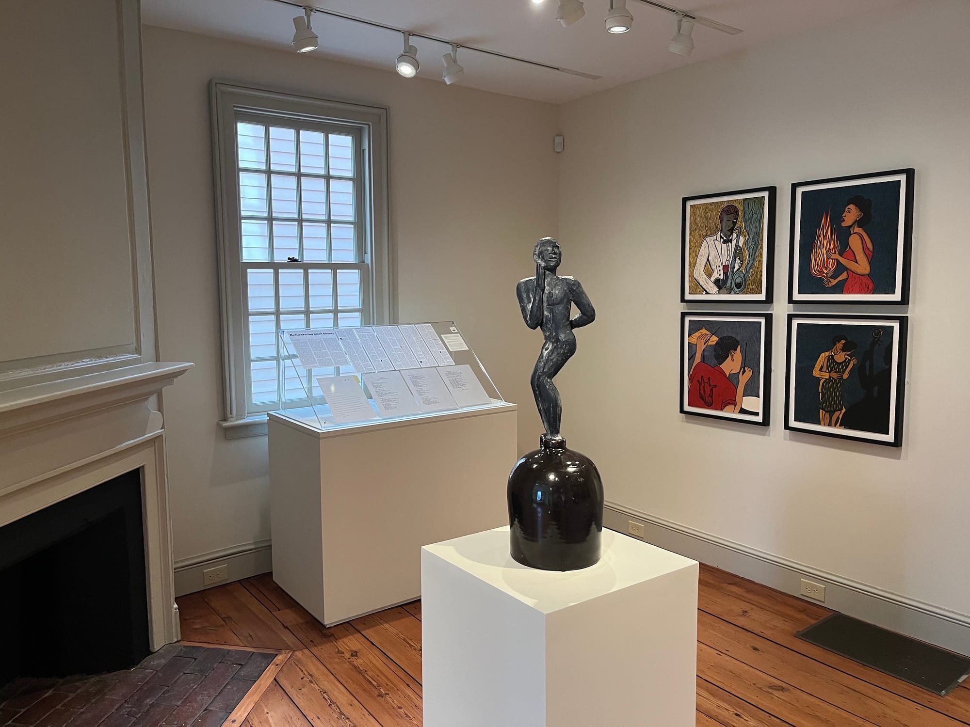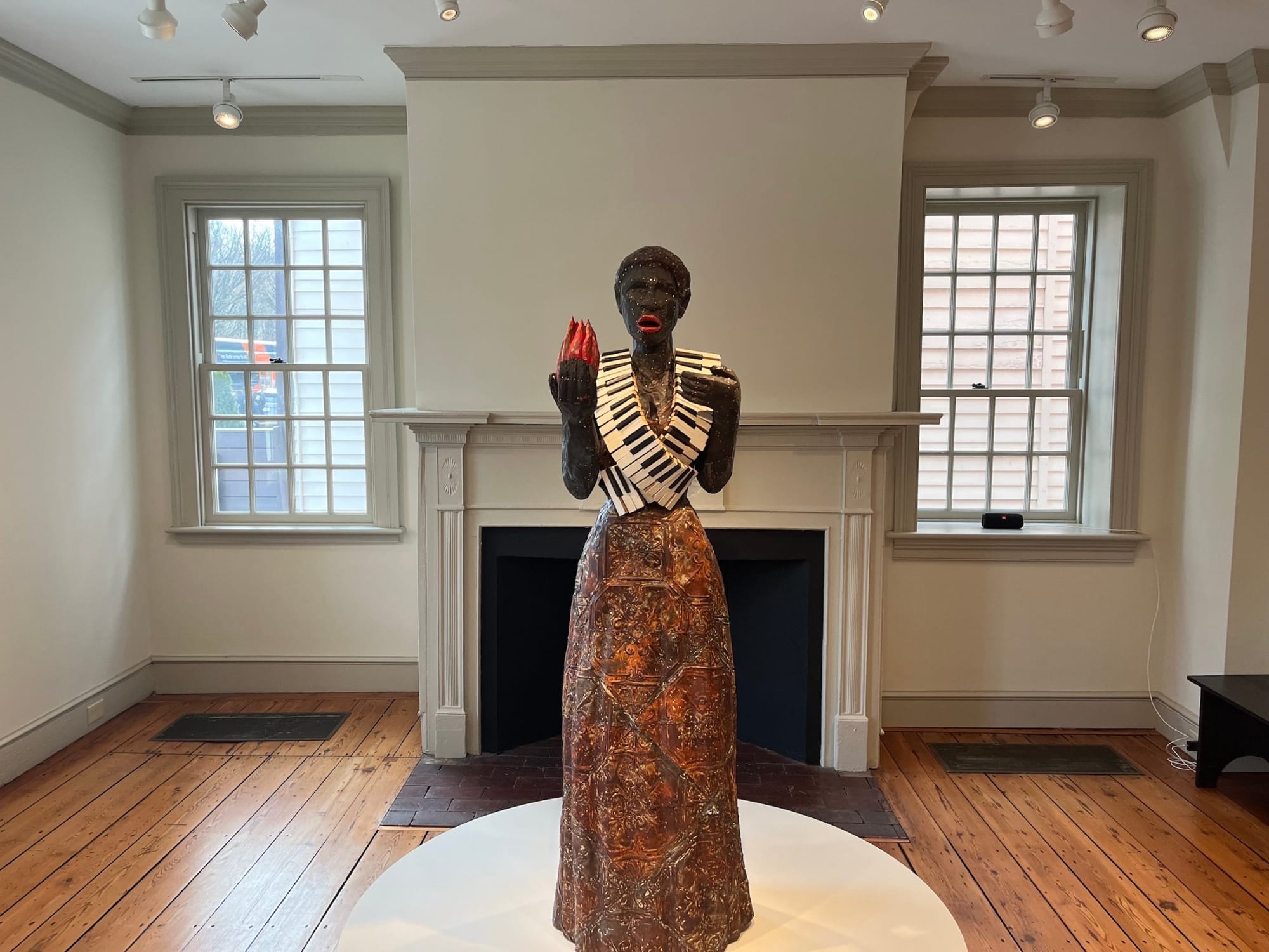 The Art@Bainbridge building, an old colonial home built in 1766, is a small outpost of Princeton's general art museum that has seen multiple iterations over the last three centuries. Enslaved individuals once worked in the house and lived on its property. The building is carefully renovated but retains slanting pinewood floors, fireplaces, old trim, and a colonial exterior, constant reminders of its past. The work exhibited inside does not shy away from this history.