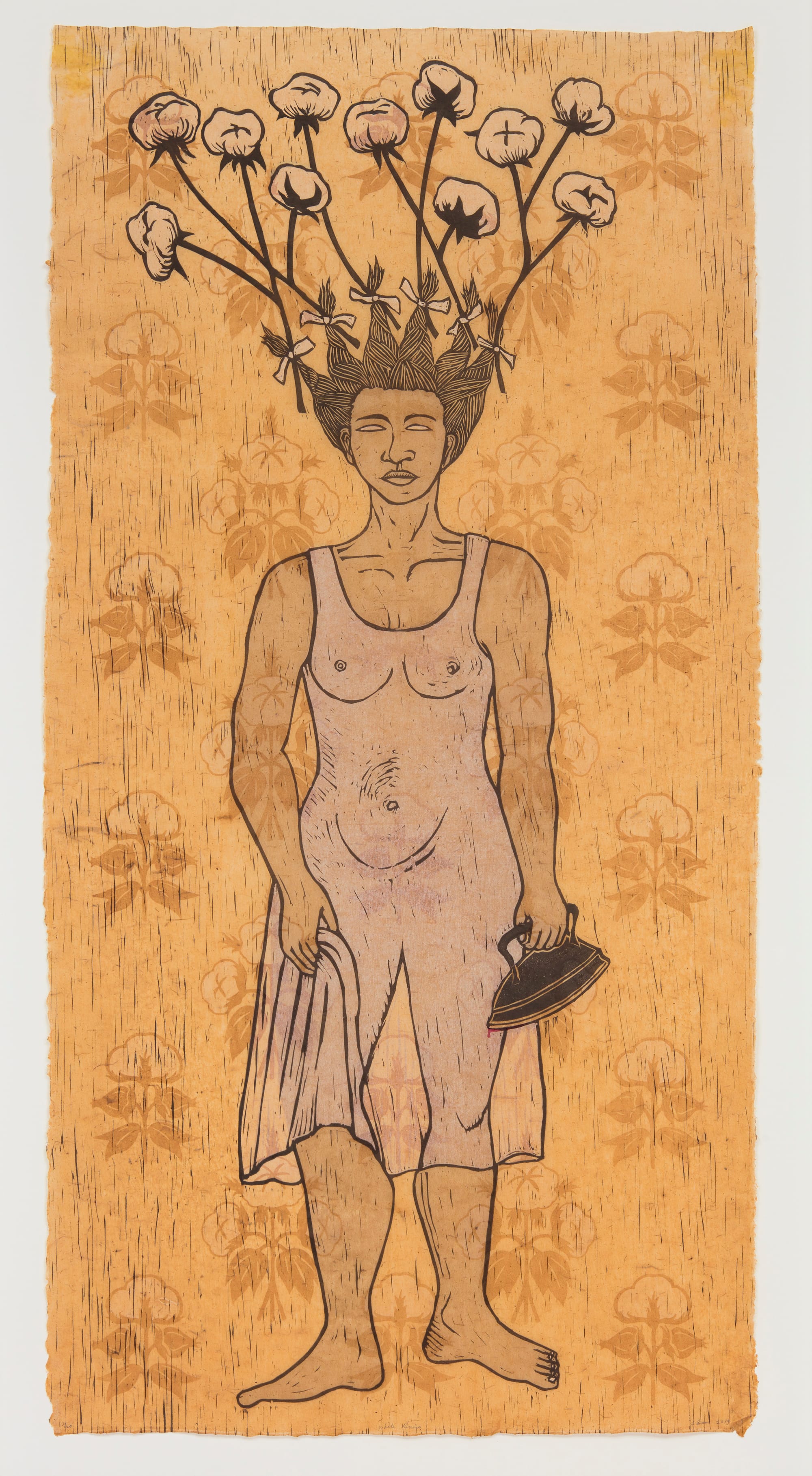 In the back, a gallery space showcases the research material Morrison used to develop Beloved (1987), her most famous novel and one which directly addresses the legacy of slavery. In this room, three Saar works all feature Black women and girls with cotton tied into their hair. In "White Guise" (2019), the artist has crafted a thin backing for her print. Its floral decals, which are actually cotton plants, make the material look like wallpaper. The life-size depiction of the enslaved woman working in a domestic space, holding a clothing iron, is jarring in the colonial room, which was perhaps once lined with wallpaper, too.