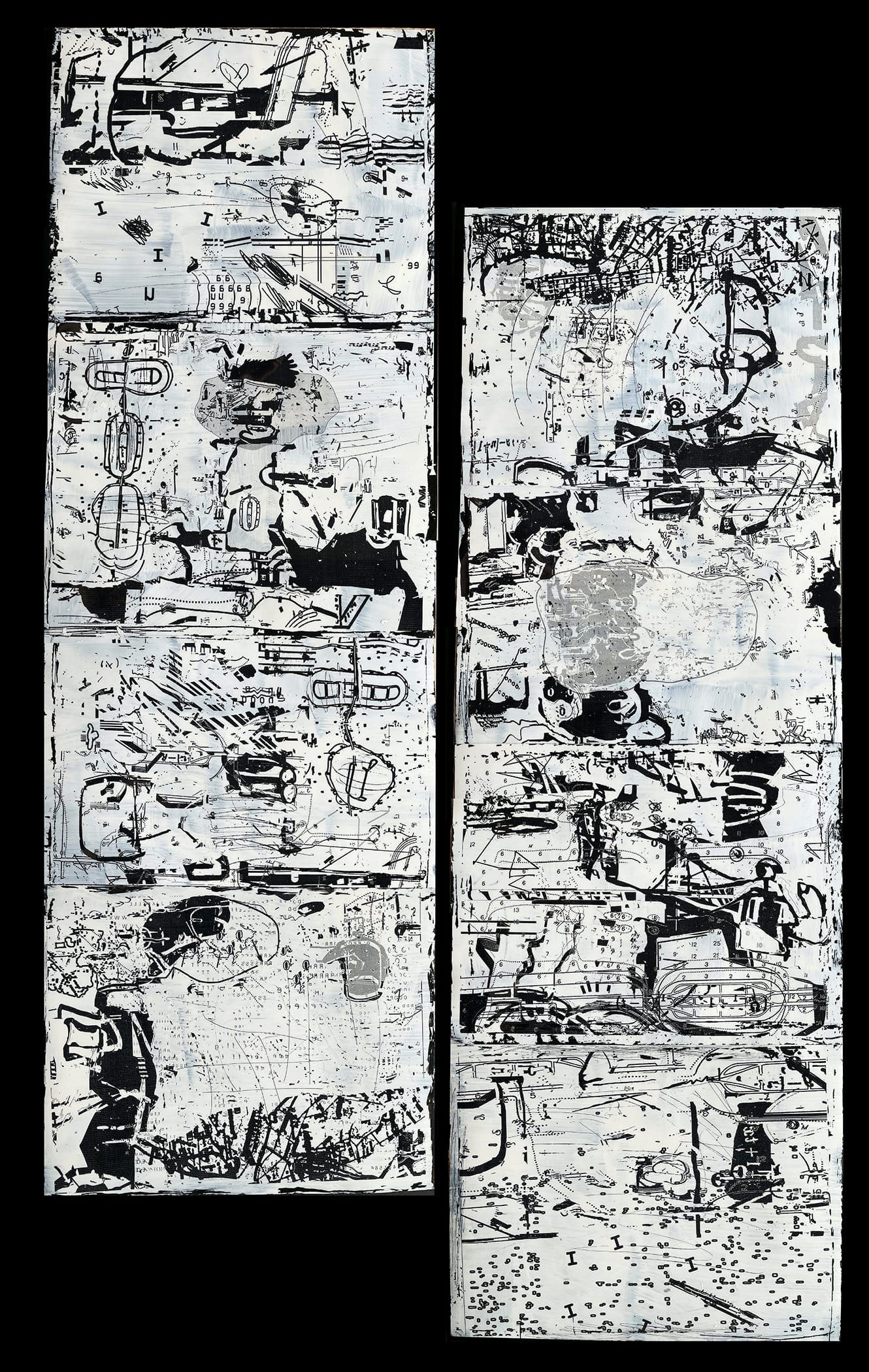 Appel’s vertical and horizontal formats suggest a narrative that can be read either top to bottom or left to right, but what is within their borders resists that understanding. Instead, the work conveys simultaneously turmoil, states of disintegration, metamorphosis, and fragments verging on narrative. Because of the format and scale of her vocabulary, the work cannot be absorbed in a single glance. Comprehension seems just beyond our reach, like something we call “dark matter.”