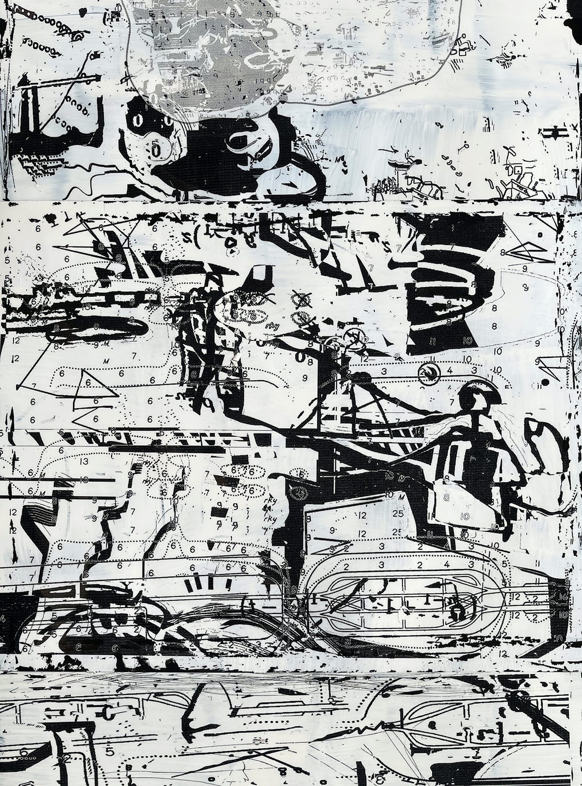 What are these places to which Appel’s works transport us, where images, marks, smears, erasures, bits of language, and distorted and stretched musical scores exist, all hinting at something that both invites and resists being deciphered? With time, you begin to notice the way she suggests connections through proximity or in the figure-ground relationships, especially in the irregular geometric forms that evoke robots and interact with the white space between them. This formal astuteness shifts Appel’s work away from writing.