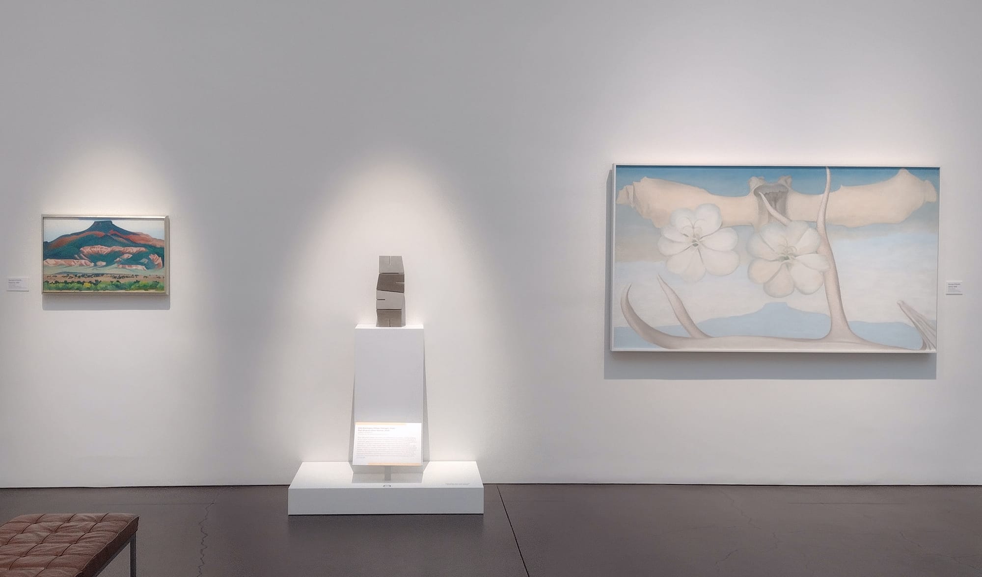O’Keeffe’s renderings of Northern New Mexico — which do not include Tewa people or culture — and the lore of her independent settler spirit are ingrained in the history of Western Modernism, and they continue to attract tourists, artists, and collectors to the region. Her self-proclaimed divinely sanctioned possession of the land is vital to consider when thinking critically about her art. So I was eager to see Tewa Nangeh/Tewa Country at the Georgia O’Keeffe Museum, which includes works by Tewa Pueblo artists, scholars, and culture bearers alongside some of O’Keeffe’s iconic landscapes, thus dispelling the problematic “O’Keeffe Country” narrative.
