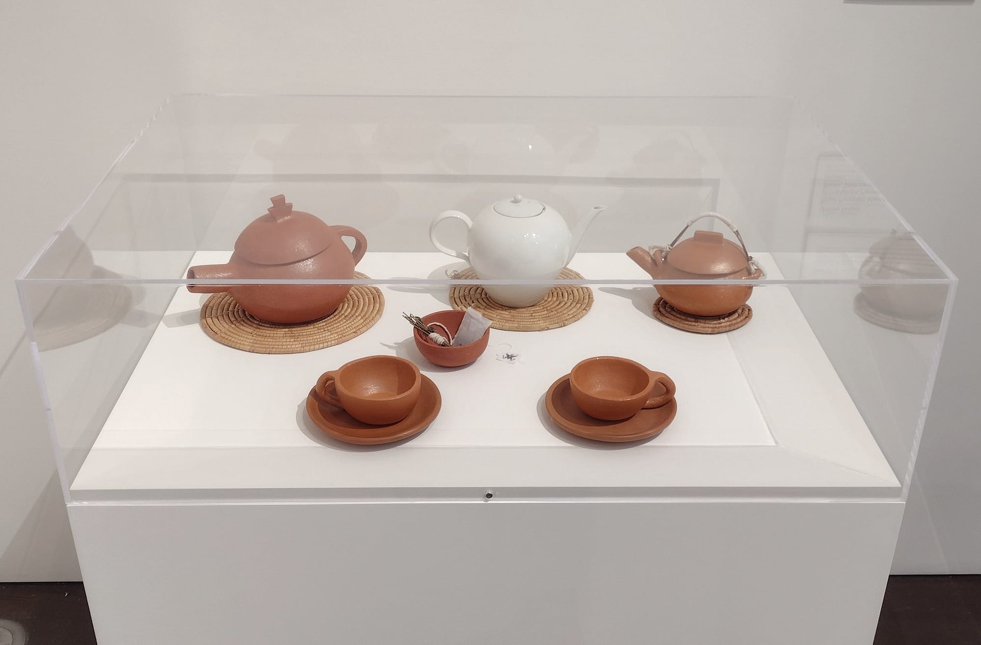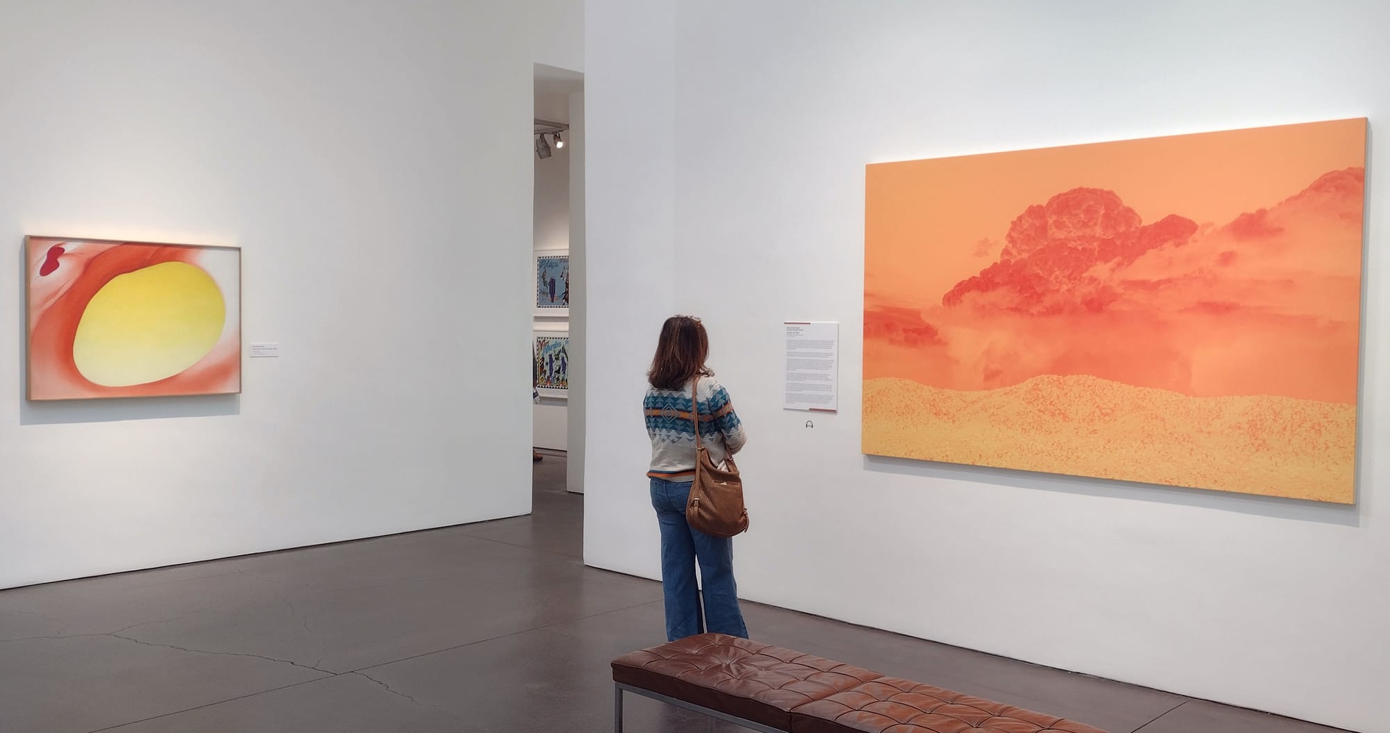As I looped back through the gallery, I stopped and stood in front of “Let’s Have Tea, Tea Time with Georgia” (2025) by Marita Hinds (Tesuque Pueblo). The artist dug clay from the ground and fired it, and gathered red willow, to make a teapot, cups, and saucers — her first attempt at doing so. The set is installed in a vitrine with one of the many teapots that O’Keeffe collected. Here, the contrast is striking: one, a handmade item made to be shared, the other a designer object to be purchased. The museum label includes Hinds’s provocative question: If the two women had tea together, what would they talk about?