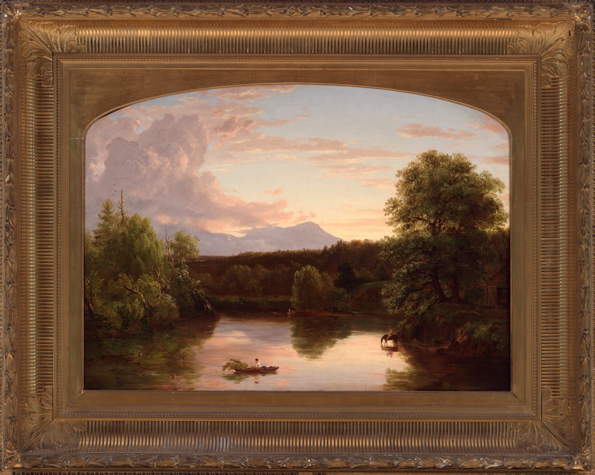 For every idyllic landscape in the show, such as Hudson River School founder Thomas Cole’s placid view of a Catskills sunrise (“North Mountain and Catskill Creek,” 1838), there are at least two others in which human industry — smokestacks, quarries, barges — intrudes upon the view. The most stark among them is Ashcan School painter George Benjamin Luks’s “Roundhouse at High Bridge” (1909–10), which depicts a Bronx sky so thoroughly darkened by pollution that the canvas verges on monochrome. The color palette of Daniel Putnam Brinley’s “Hudson River View (Sugar Factory at Yonkers)” (c. 1915) is less apocalyptic, yet its cluttered factory town foreground predominates the scene.