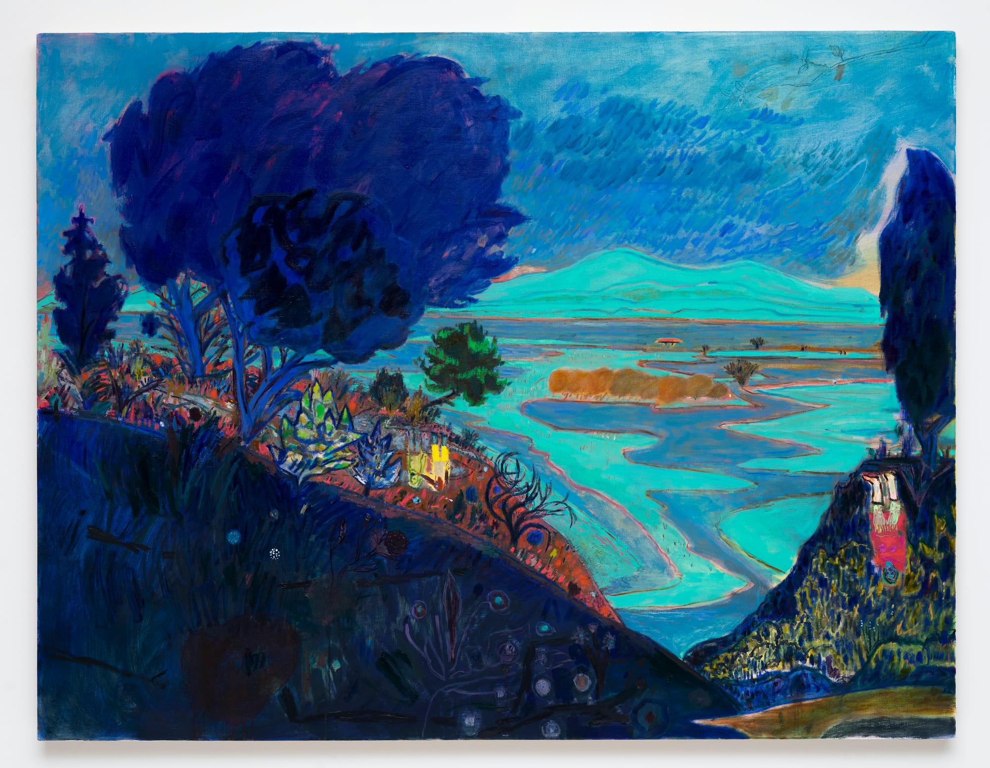 The exhibition’s contemporary artists, many from marginalized backgrounds, offer particularly compelling takes on aesthetic visibility. Anthony Papa’s mid-1990s paintings, made while he was an inmate at Sing Sing Correctional Facility, depict the Hudson River from behind the scrim of the prison’s barbed wire fences, hinting at the human systems of control that often remain outside landscape painting’s frame. In Alan Michelson’s 31-minute film “Shattemuc” (2009), whose title comes from a Native term for the Hudson, a marine searchlight projected at night onto the river’s shoreline creates a surveillance atmosphere. Athena LaTocha’s mixed media abstraction, “The Discovery of Slowness” (2022), takes a long view on visibility; its green washes of ink on paper, sandwiched between lead impressions of rock outcroppings, situate anthropic forces as imperceptible blips within the geologic record.