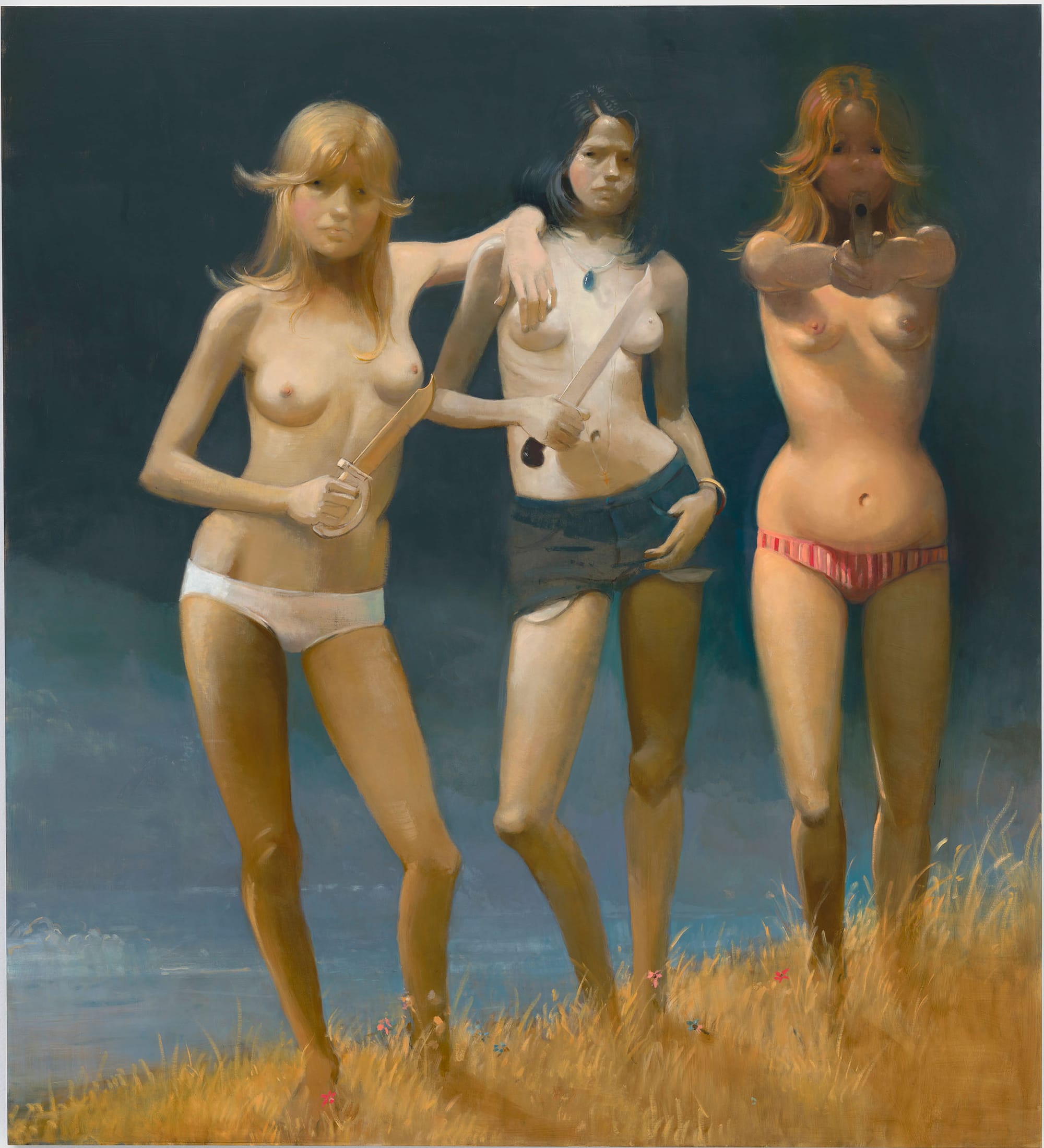 I'm not aware of anyone alive who paints as easily, or seems to paint as easily, as Lisa Yuskavage. This, of course, is half her power, which makes the second half — her attitude ... I mean her message ... I mean the stories she tells — so affecting. In the painting "Scissor Sisters” (2020), which you walk smack into in the first room at Zwirner, three topless women, two brandishing the sort of knives with which you gut a deer, the third pointing a handgun at the viewer's face, glower down from the canvas. Paint made flesh; paint made flipped bangs; paint made clouds of the coming storm. As in past work, Yuskavage wields, like these knives, the language of centuries of art, here of Rubens, Raphael, Canova and others — though all of her "graces" brazenly face front — to say something of the cultural moment, her own and ours. Who the fuck are you looking at; we're not Charlie's Angels.