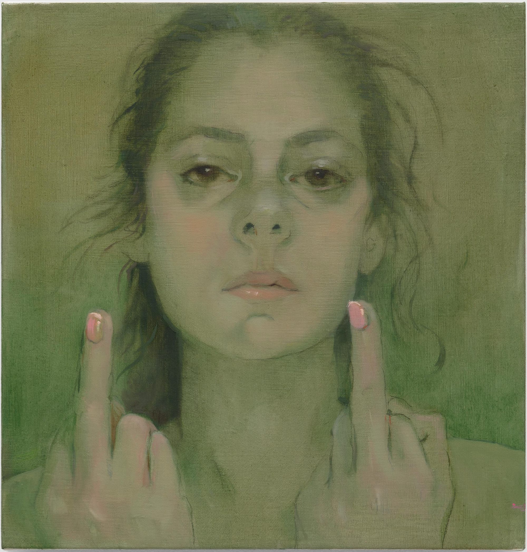 In a painfully expressive portrait of a young woman titled “The Fuck You Painting,” (2020) a face that you want to stare into, full of life and pathos and very convincing anger, the subject and the artist let the viewer know where they can go with their gaze, curiosity, and sympathy, with not one but two middle fingers. No one else engages and challenges a viewer so directly in that specific way, like a passenger on the bench across the subway car with his eyes fixed on yours. There's a pull and push with subject and viewer, but it's all pull with the paintings themselves; we don't want to look away.