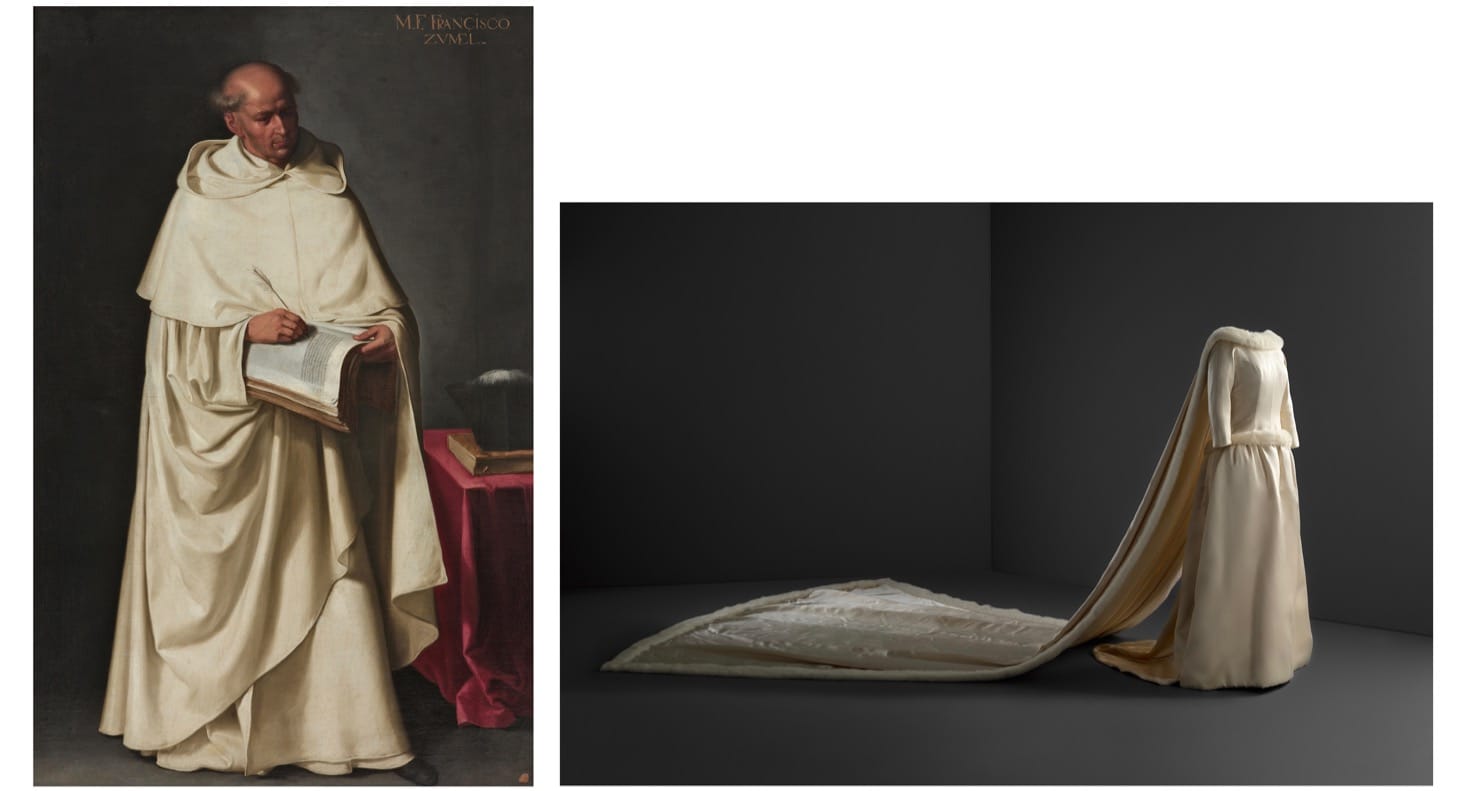 Christian Dior once said, “We do what we can with fabric, but Balenciaga does anything he wants.” Balenciaga preferred heavier fabrics like wool, velvet, and stiff silk that he could fashion into unexpected forms and folds. His substantial, sculptural garments find their parallel in Zurbarán’s portraits of monks and saints, whose voluminous robes offer ample territory for the painter to explore the physical possibilities of fabric. Balenciaga’s streamlined, minimally embellished wedding dresses dialogue with Zurbarán’s life-size canvases, not only because they inject geometry into drapery, but also because they transmit purity through austerity.