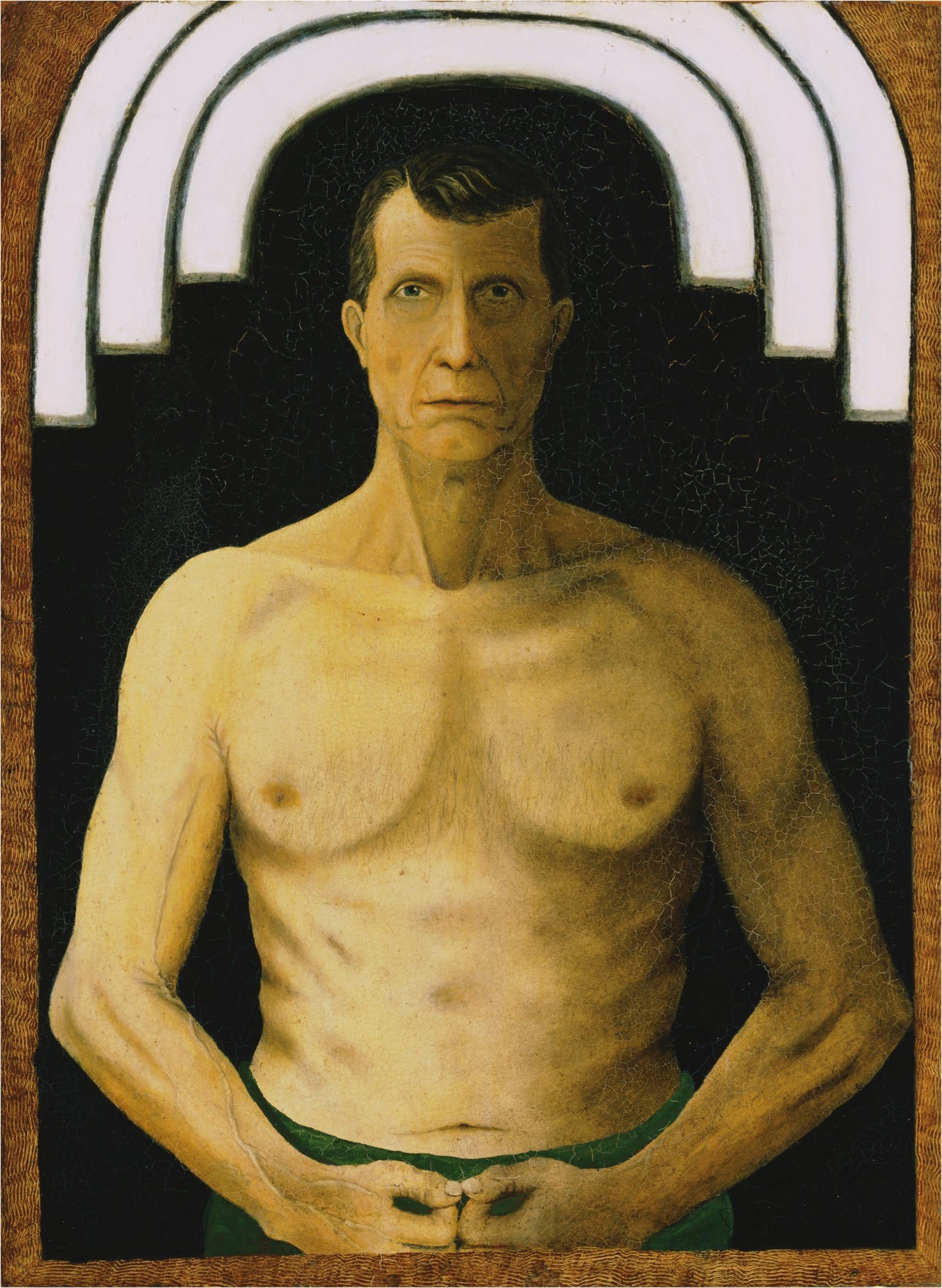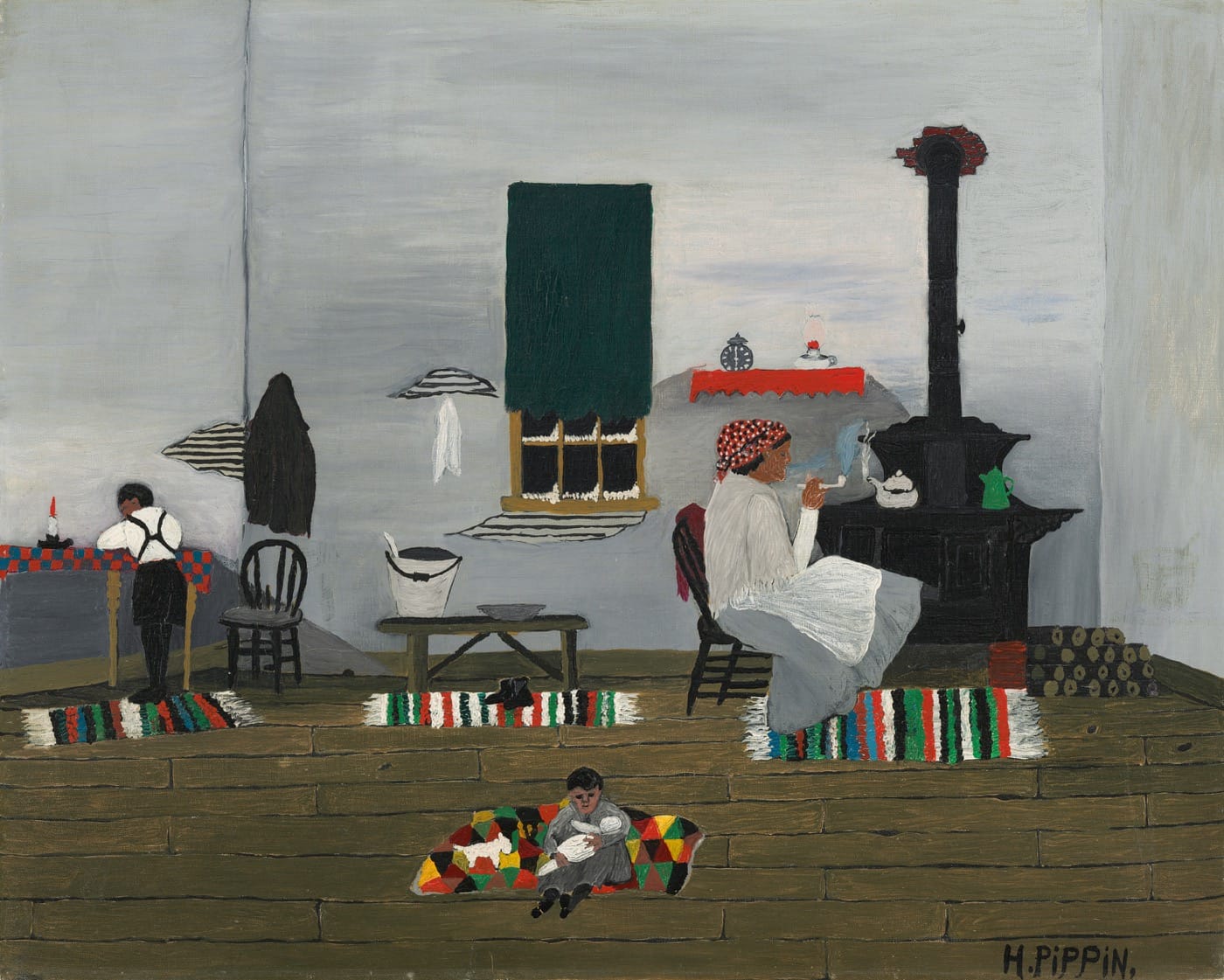 The next gallery features mainstream artists who appropriated outsider art styles, including Marsden Hartley’s 1918–19 painting “Santos, New Mexico” when he explored Hispanic and Pueblo Indian themes after a visit to New Mexico. Folk art-ish paintings by New York modernist painters Charles Sheeler and Yasuo Kuniyoshi also are on display, including Kuniyoshi’s 1923 oil painting “Boy Stealing Fruit” featuring a pudgy boy planning his getaway with a purloined banana. Their work is contrasted with paintings by outsider artists, including John Kane’s spare and haunting 1929 “Self-Portrait” showing a bare-chested man with a dead-eyed stare and a body marred by the ravages of time. Henri Rousseau’s 1910 “Tropical Forest with Monkeys” from his engaging series of jungle paintings is featured with two less interesting paintings. Rousseau is portrayed as an outsider artist even though his work was exhibited regularly in the Salon des Indépendants in Paris during his lifetime, and Pablo Picasso held a banquet in his honor in 1908.