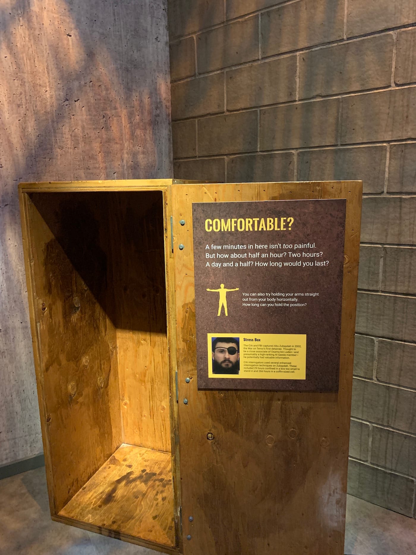 Prasow also pointed out the photograph attached to the room’s “stress box” featuring a mugshot of Abu Zubaydah, who experienced the torture device as the first detainee captured in the “War on Terror” under the presumption that he was a high-ranking member of Al-Qaeda. She wondered aloud if the museum obtained a privacy waiver from him. Prisoners aren’t allowed to profit from illegal conduct, but technically, he’s not a prisoner. Zubaydah has never been charged with a crime and remains in Guantanamo nearly 13 years after his last transfer.