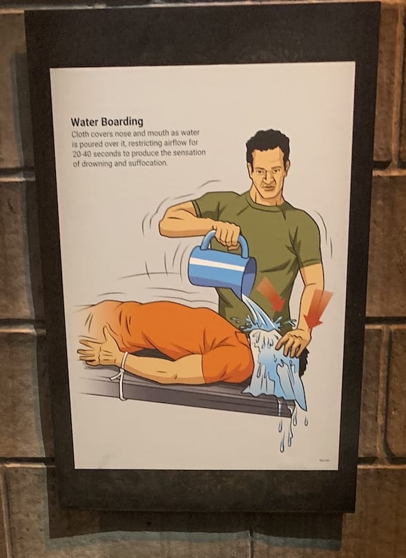 Text near the room’s entrance asks: “Even if it’s effective is harsh interrogation compatible with our ethics and values?” Illustrations of torture equipment through the ages line one wall, which also features an abridged historical debate about the practice’s viability (George Washington and Napoleon Bonaparte? Against it. Imperial Japan and the Bush administration? For it.) The installation also includes several cartoons featuring a dark-skinned man with facial hair being experiencing several forms of torture alongside an image of the World Trade Center exploding. Additionally, curators have staged a waterboarding table and a “stress box” in which detainees of the “War on Terror” were pretzeled into for hours or days.