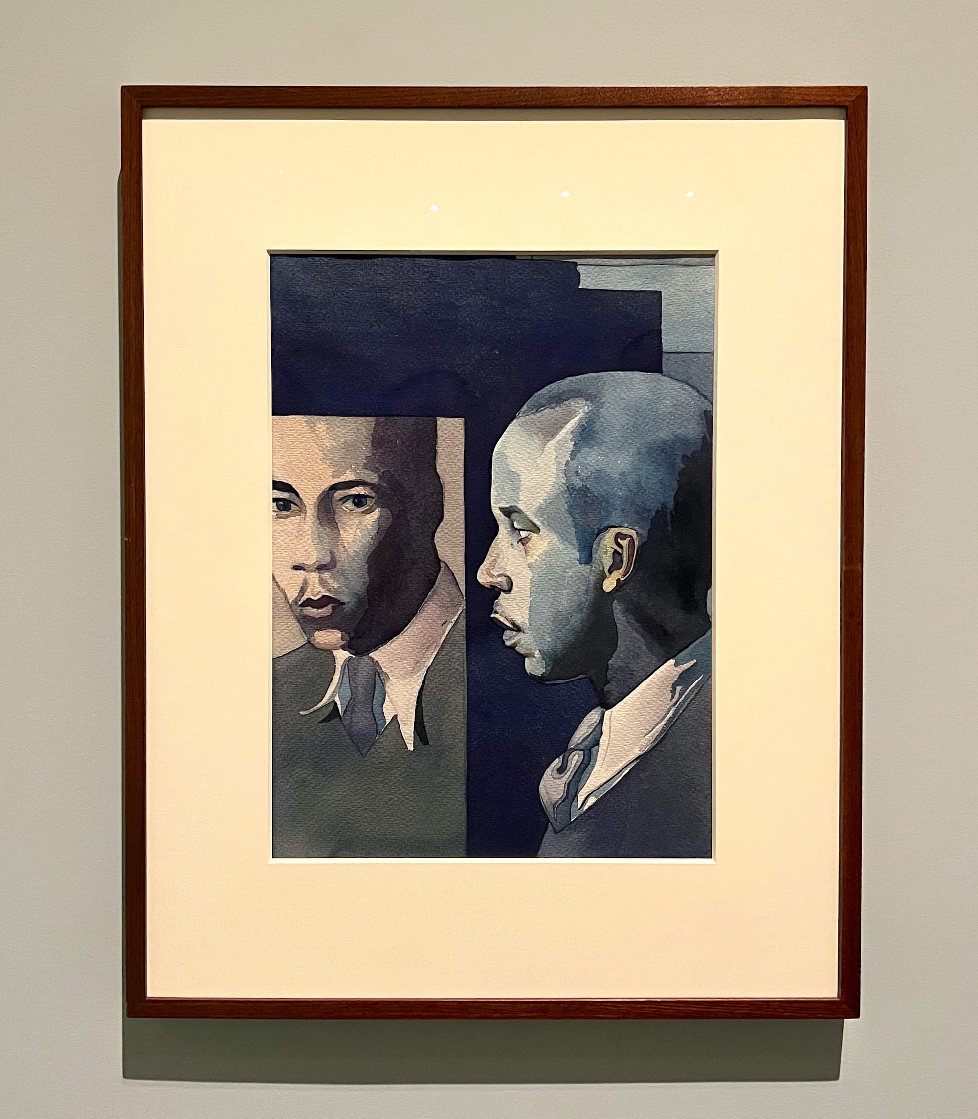 Murrell’s curating demonstrates how these ideologies and debates were not just theoretical, but permeated the realities of Black life. For example a pensive self-portrait by Samuel Joseph Brown (1941) reifies Du Bois’s term “double-consciousness,” which refers to the idea that Black people always see themselves simultaneously through two sets of eyes: their own gaze and the external, White gaze. The artist is literally doubled as he looks at his mirror reflection, probing his interiority with inquisitive and slightly unsettled eyes.