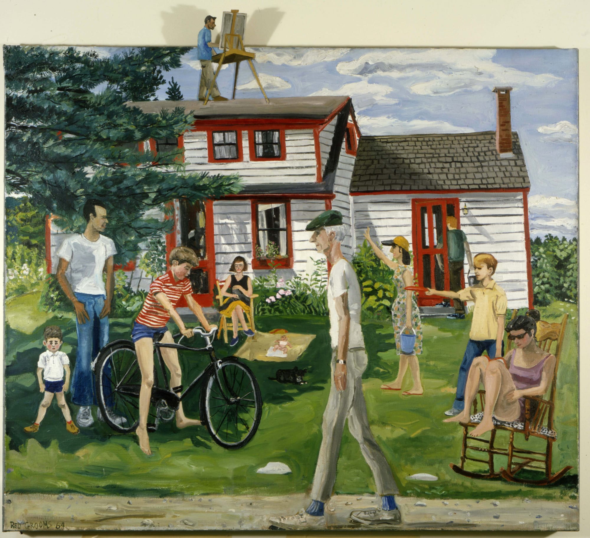 The exhibition title comes from the name of the road on which Alex Katz and Lois Dodd (onetime classmates at Cooper Union) bought a house in 1954 — “slab” was a term for leftover lumber or granite, both produced in the region. It is also the name of a 1964 painting by Red Grooms in which filmmaker Rudy Burkhardt is painting on a rooftop. Grooms himself is walking through the door to the house in the painting, and the poet and dance critic Edmund Denby strides across the canvas “like a gangly elegant bird,” in the words of Edith Schloss.