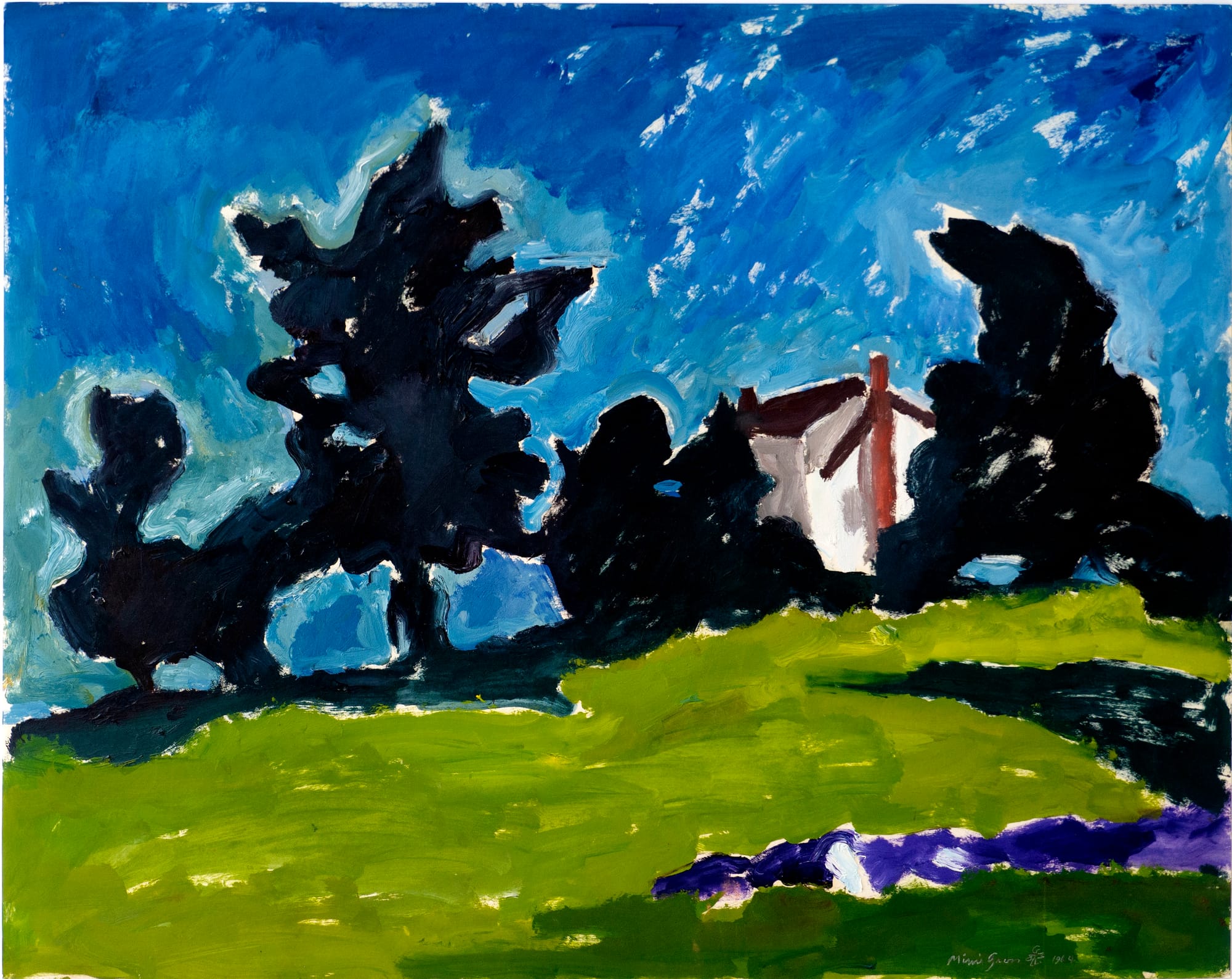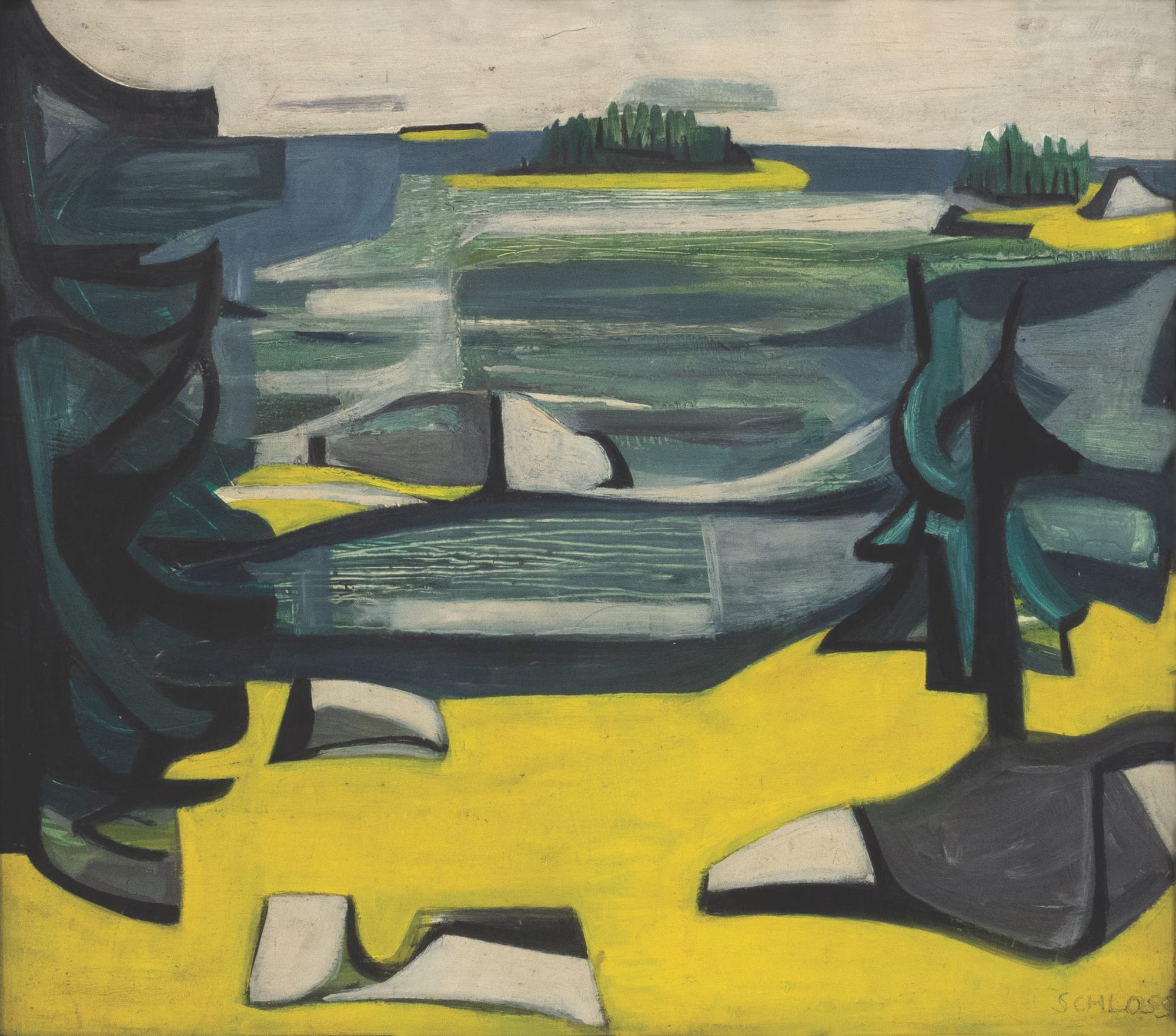 In Katz’s painting “Lakewood” (ca. 1948-49) of a red cottage under a royal blue sky, with billowing white clouds swimming by like fish in a sea, we see the structure where Dodd and Cohen once had a gallery, not far from Skowhegan. They also sold clothing and jewelry they designed from this space. Cohen’s “Skowhegan,” a colorful cluster of shacks, is one of her few surviving works of the era. Over time Schloss turned toward abstraction: her “Barbours Shore, Deer Isle Maine” (1958) is a traditional seascape compared to her work from the 1970s.