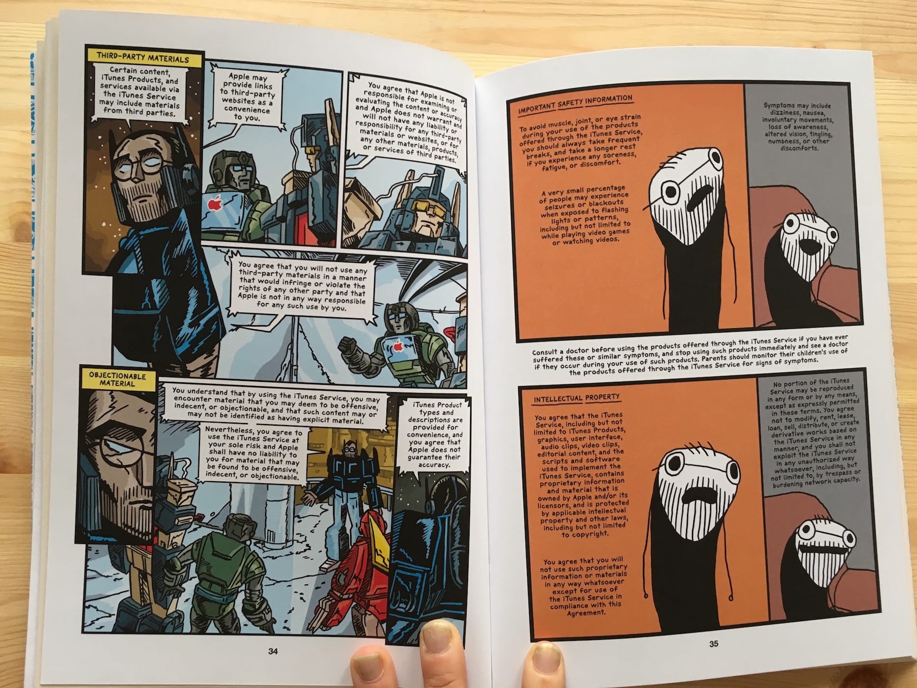 The goal of appropriation is often to show familiar material in a new light. Perhaps the inclusion of the less-legible pages brings to light similar failings the onslaught of image-text combinations on the internet—advisement banners, flashing pop-ups, and the like—that are likewise often seen but seldom read. Using a widely known but rarely read text as backdrop for images that are likewise familiar but perhaps not deeply interrogated, Sikoryak investigates the ways in which images and texts can be read together. In his seminal work Understanding Comics, author and theorist Scott McCloud outlined the various ways in which images and texts interact in comics—such as word specific, picture specific, parallel, and inter-dependent—and in Terms and Conditions, Sikoryak builds on these relationships. Using a text that’s only available digitally, he demonstrates that these relationships in fact extend beyond comics and into the numerous image-text combinations that propagate the internet and our daily lives.
