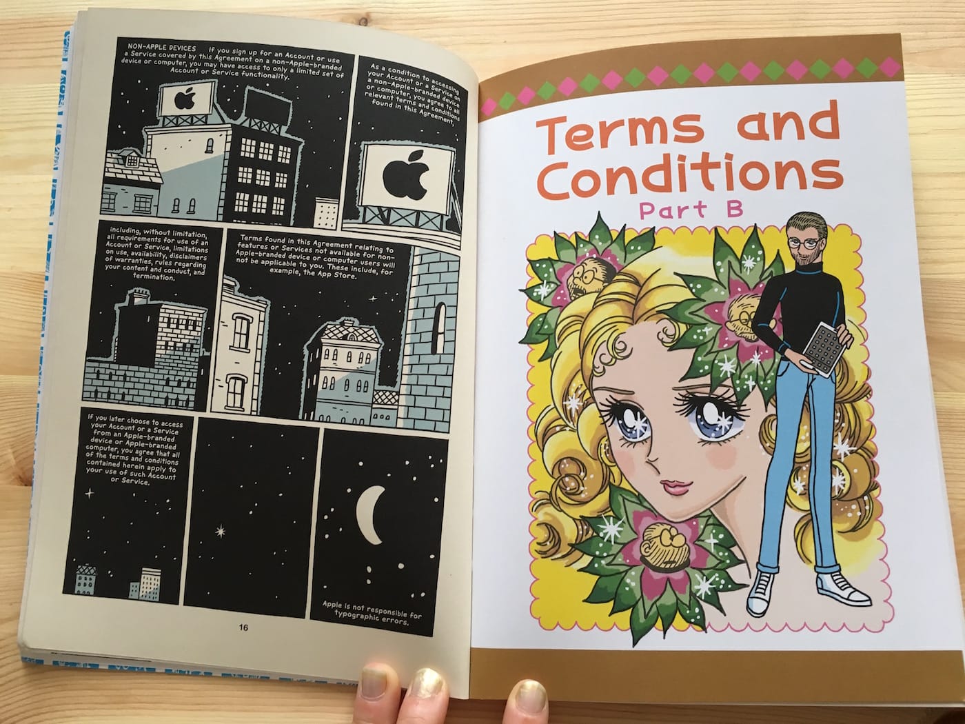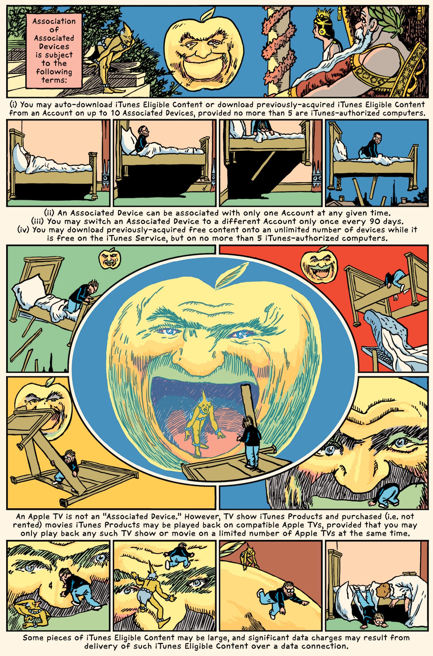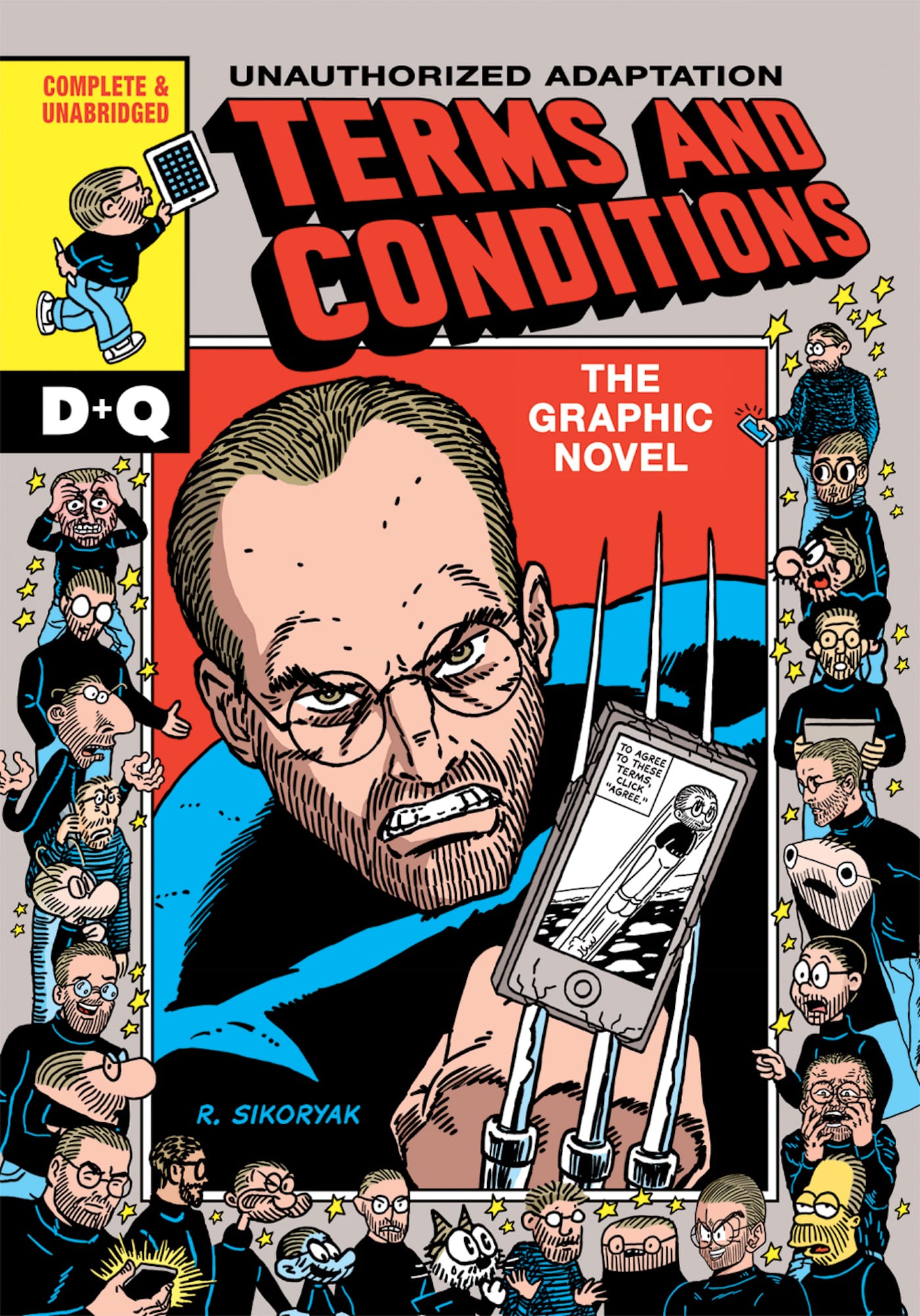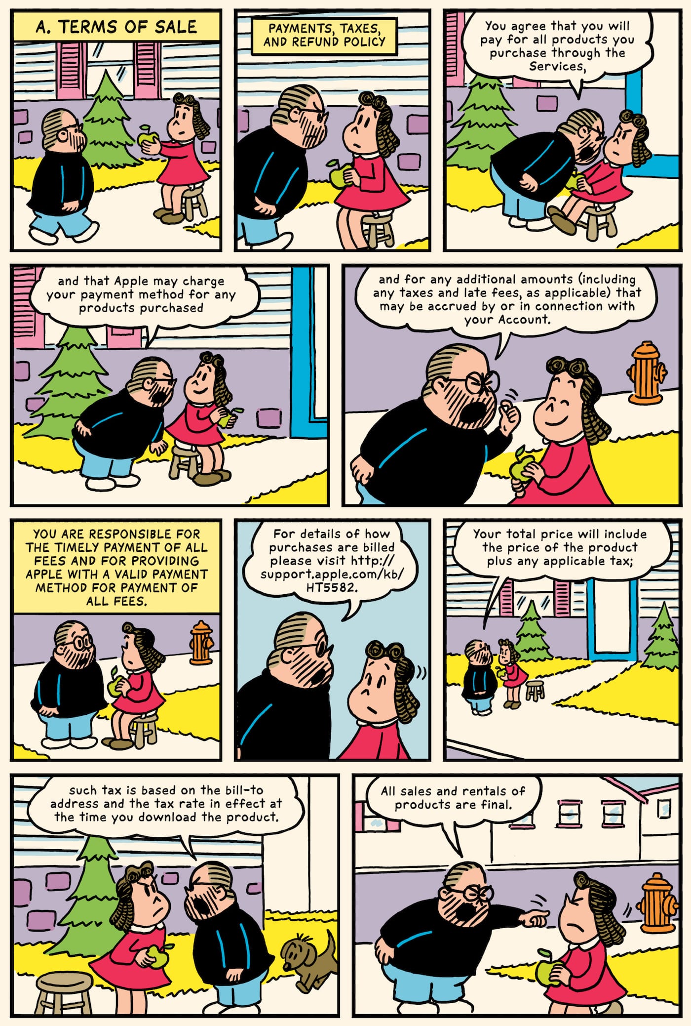A panel in R. Sikoryak’s latest book shows a man leaning over a woman shouting, “You agree that you will pay for all products you purchase through the Services.” In the next panel he continues, “and that Apple may charge your payment method for any products purchased.” The girl is Little Lulu, from the eponymous weekly comic begun in 1935. The boy, wearing glasses and a scrappy beard, is Steve Jobs, and the words are lines from the iTunes Terms and Conditions Agreement, the text of which is quoted in full in Sikoryak’s Terms and Conditions. This continues Sikoryak’s tradition of appropriative publications, following his previous Masterpiece Comics, which took its text from literary classics and its visuals from the comics canon.