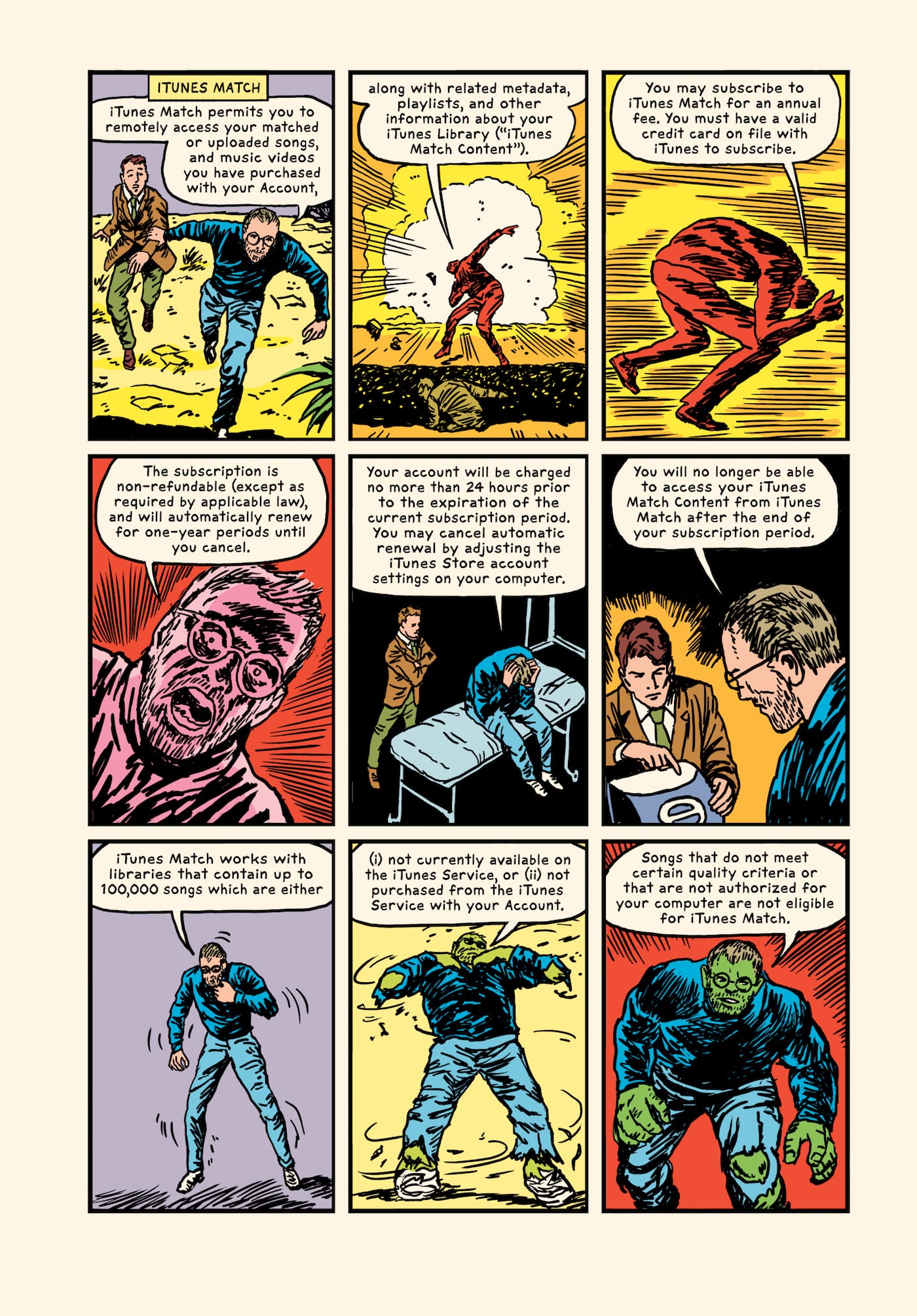 With the proliferation of iPhones, iPods, iPads and so on, nearly everyone has clicked “Agree” on the Terms and Conditions, yet very few have actually read the agreement itself. Placing it as the body text, Sikoryak questions whether images make this text more legible. Just as the full text of the book is appropriative, so too are the visuals, with each page illustrated in the style of a different comic, creating single-page mash-up vignettes of obtuse techno-speak and familiar graphics. In a later spread, Jobs slowly transforms from Bruce Banner into the Incredible Hulk as he says, “You may subscribe to iTunes match for an annual fee. You must have a valid credit card on file with iTunes to subscribe.” As the large green hero in the final panel, he further explains: “Songs that do not meet certain quality criteria or that are not authorized for your computer are not eligible for iTunes Match.”