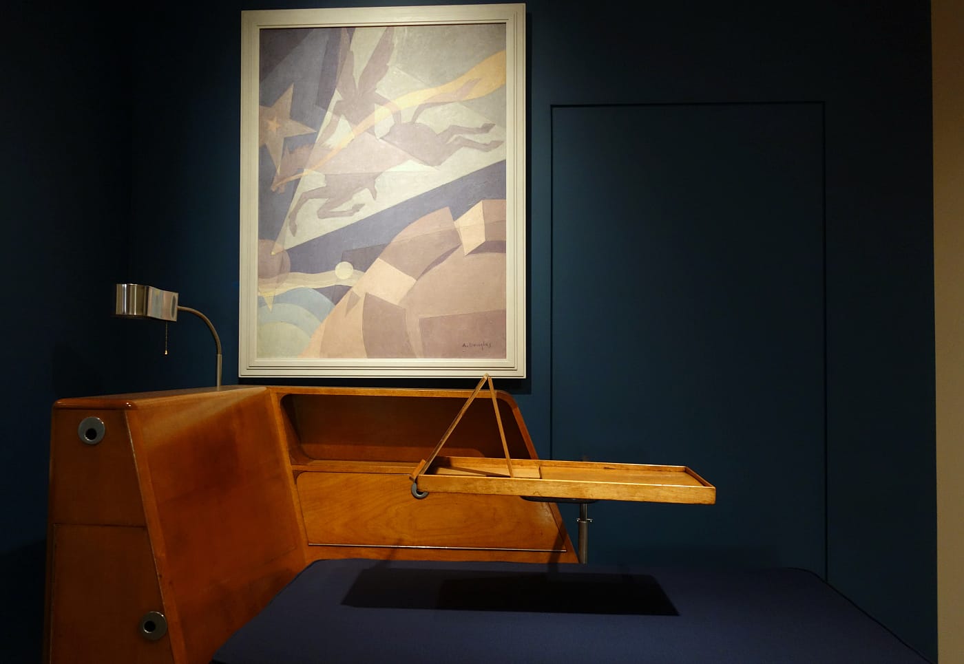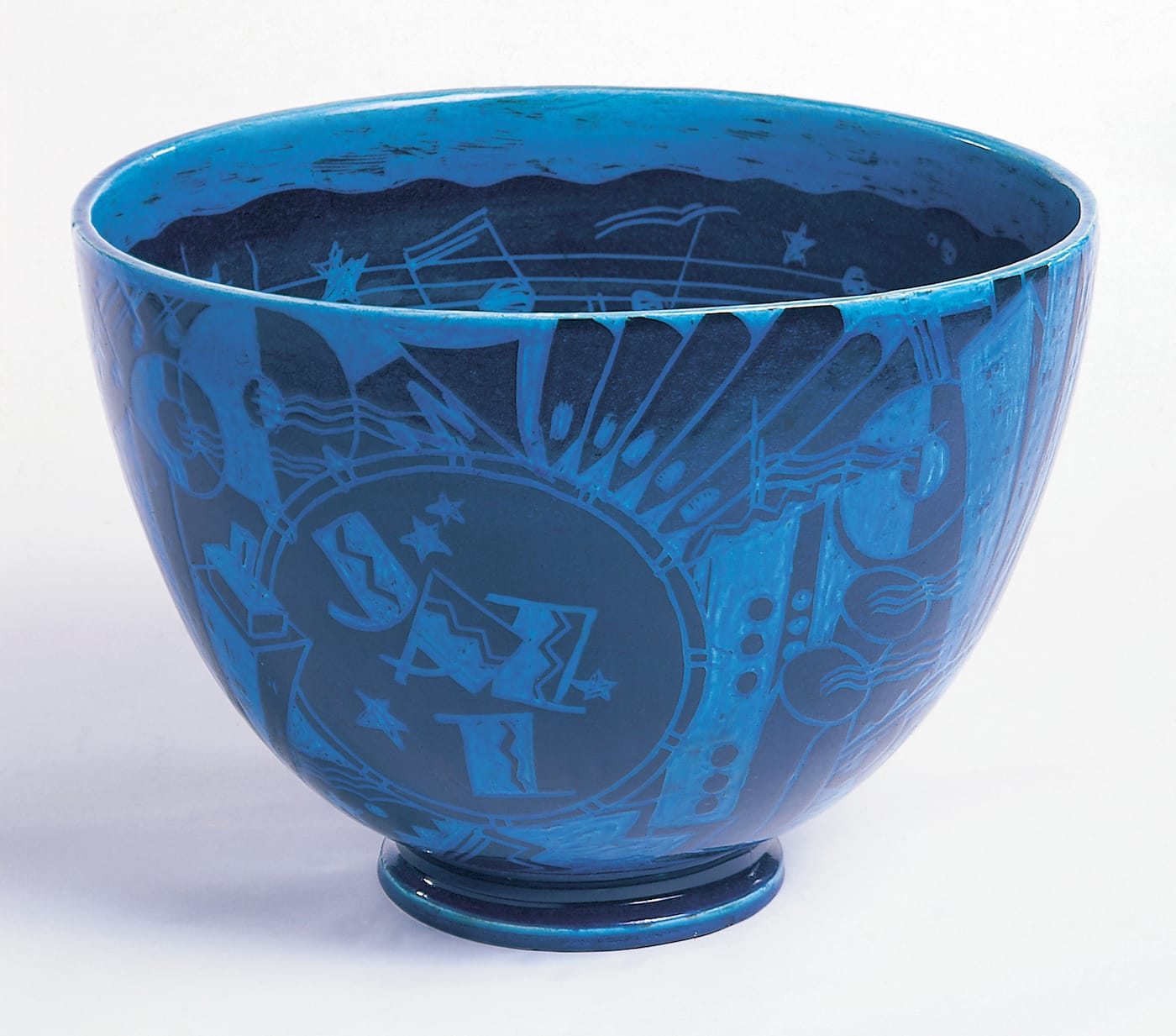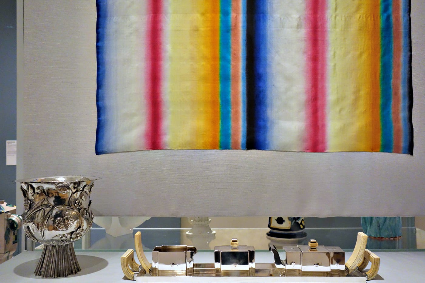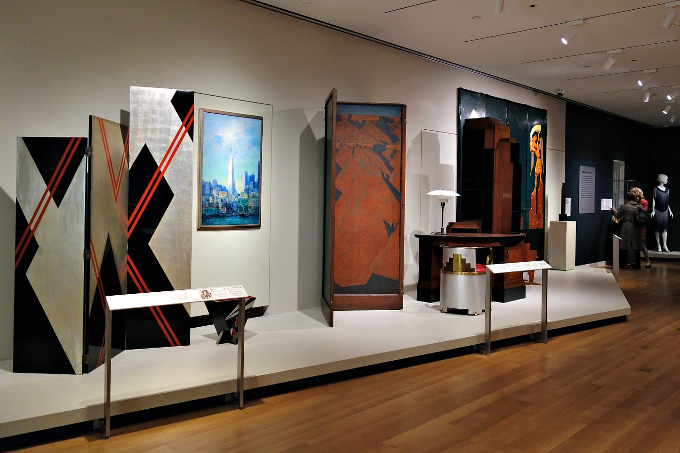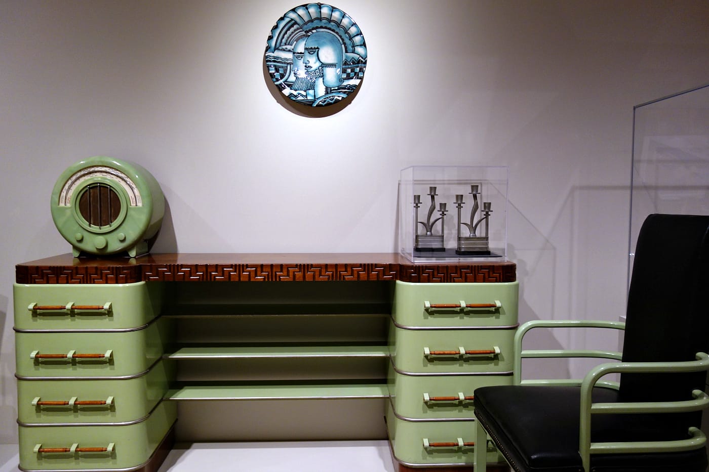 Centered on themes like “Bending the Rules” and “Abstraction and Reinvention,” The Jazz Age offers curated tableaux of furniture, flapper dresses, paintings, Prohibition-era cocktail shakers, and all manner of objects to demonstrate influences across media. Many of the featured designers were immigrating from Europe, or having their creations imported to the United States. Others were Americans who went abroad to study and train, picking up tubular metal techniques at the Bauhaus in Germany or ideas for bold hues from De Stijl in the Netherlands. For example, Ruth Reeves studied textiles with Fernand Léger in Paris before she worked on abstracted designs for Radio City Music Hall, and Viktor Schreckengost melded his sculpture studies in Vienna with Michael Powolny with his Ohio pottery background.