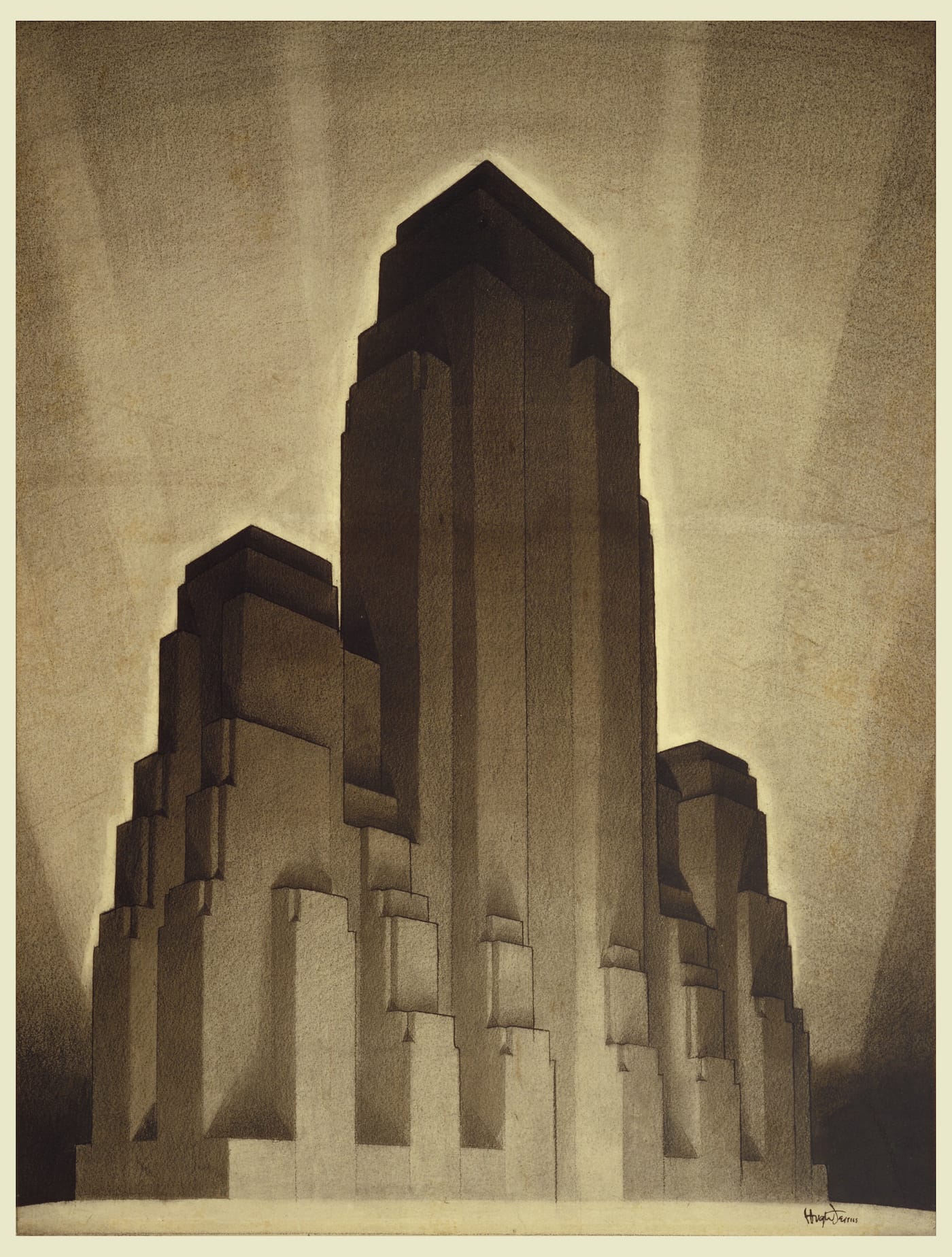 The installations in The Jazz Age reflect this rise of international exchange. British designer Wells Coates’s green, circular Bakelite radio, one of the manufacturing innovations being spread to the new middle class, rests on German designer Kem Weber’s sage-hued, streamlined sideboard, which was also intended for serial production. Russian-born craftsman Samuel Yellin’s curling wrought iron fire screen mingles with Lorentz Kleiser’s monumental tapestry showing Newark’s transformation from an indigenous village to an orderly town, both pieces demonstrating the endurance of historical European aesthetics. A towering “Skyscraper Bookcase” of California redwood with black lacquer, all designed by Austrian émigré Paul Frankl, incorporates the zoning-enforced architectural setbacks of the new skyscrapers, something which Erik Magnussen’s Cubic coffee service with its silver angles does on a smaller scale.