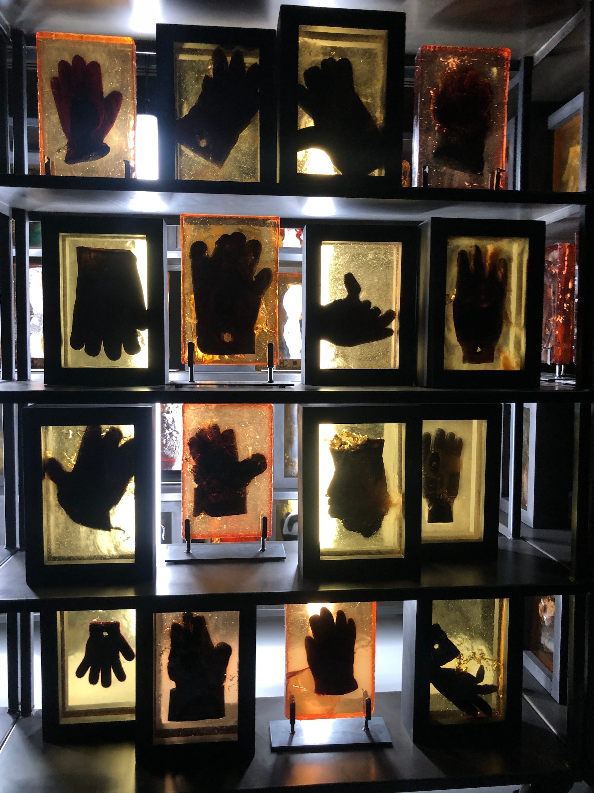 Cave, who has taught in the fashion department of the School of the Art Institute of Chicago since 1990, is best known for the Soundsuits but his work more broadly salutes material labor, which — as an artist who can build things, sculpt, and sew — Cave knows well. The large installation “Time and Again” (2000) is a tribute to his grandfather. A wall installation presents his old tools amid religious artifacts, accompanied by a series of metal rims assembled on the floor. Part tomb, part living room, Cave celebrates a man who used his hands, who fixed things and made furniture, who held to his faith. Another kind of memorial, “Truss” (1999) is dedicated to a friend who died of AIDS. Assorted work gloves are sealed in resin the color of amber. Cave again honors the hand, closing the gap between labor and art, vulnerability and protection.